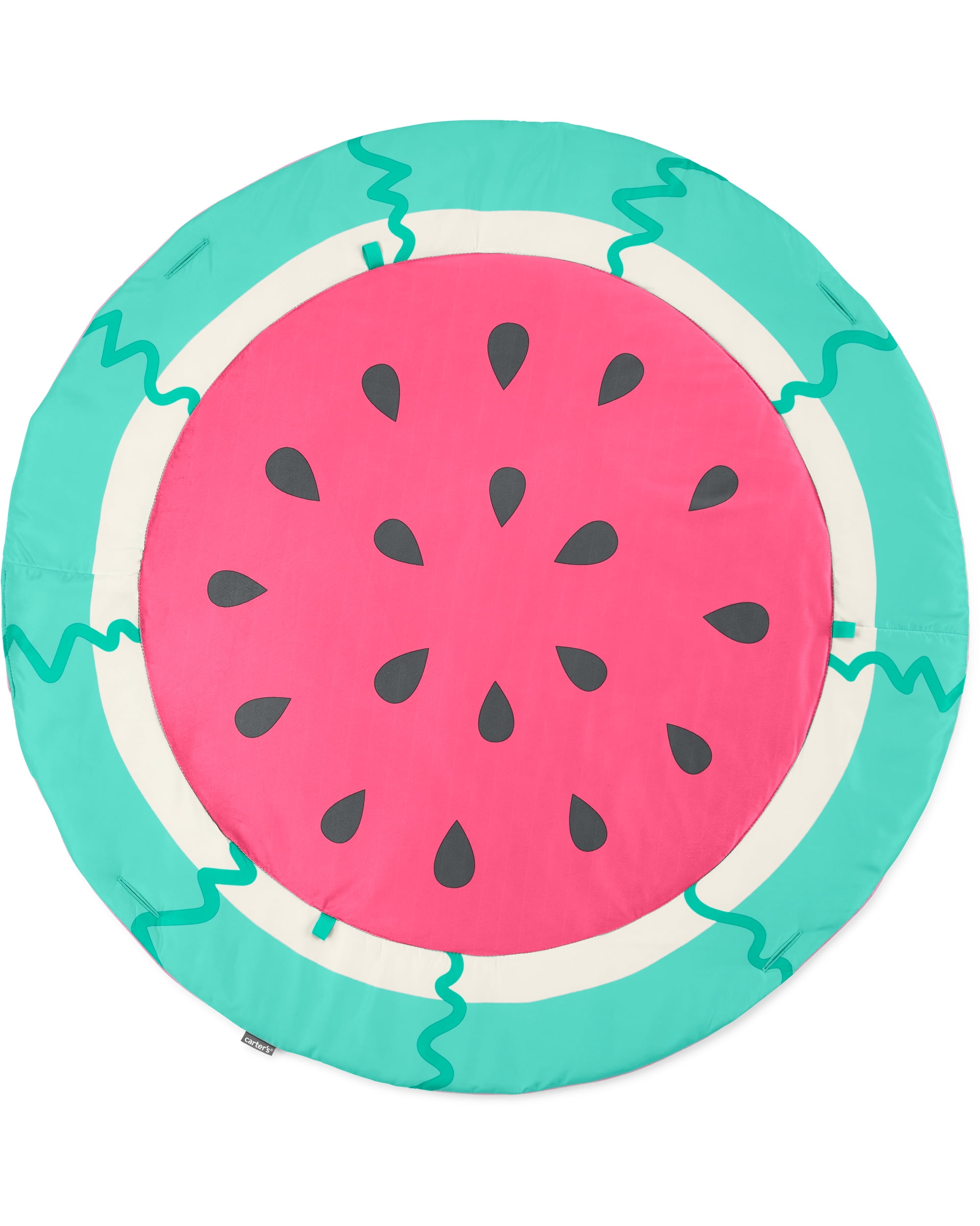 Age 0+ Three ways to play: Overhead, tummy time and seated Comfy watermelon mat Citrus for tummy time Five developmental toys include: musical pineapple, strawberry squeaker, peek-a-boo crinkle banana, cherries with rattle, orange baby mirror and leaf teether toy Size (inches): 34L x 34W x 20H; (cm): 86.4L x 86.4W x 50.8H