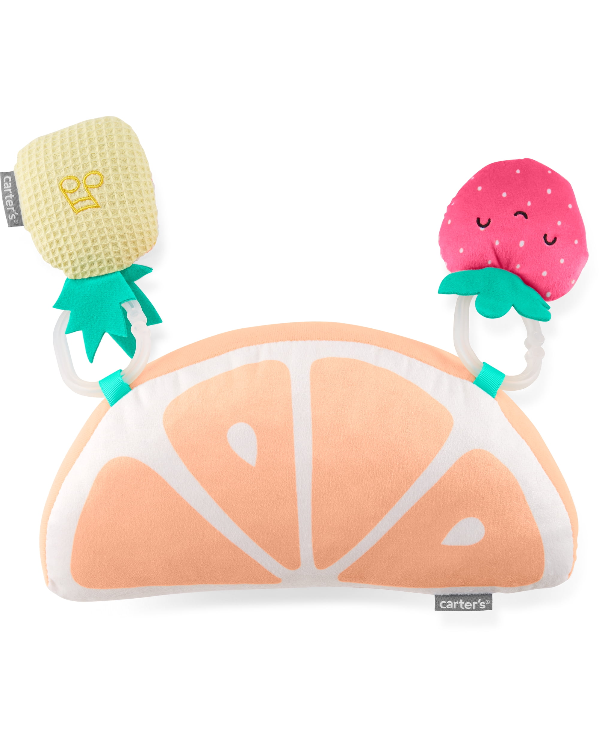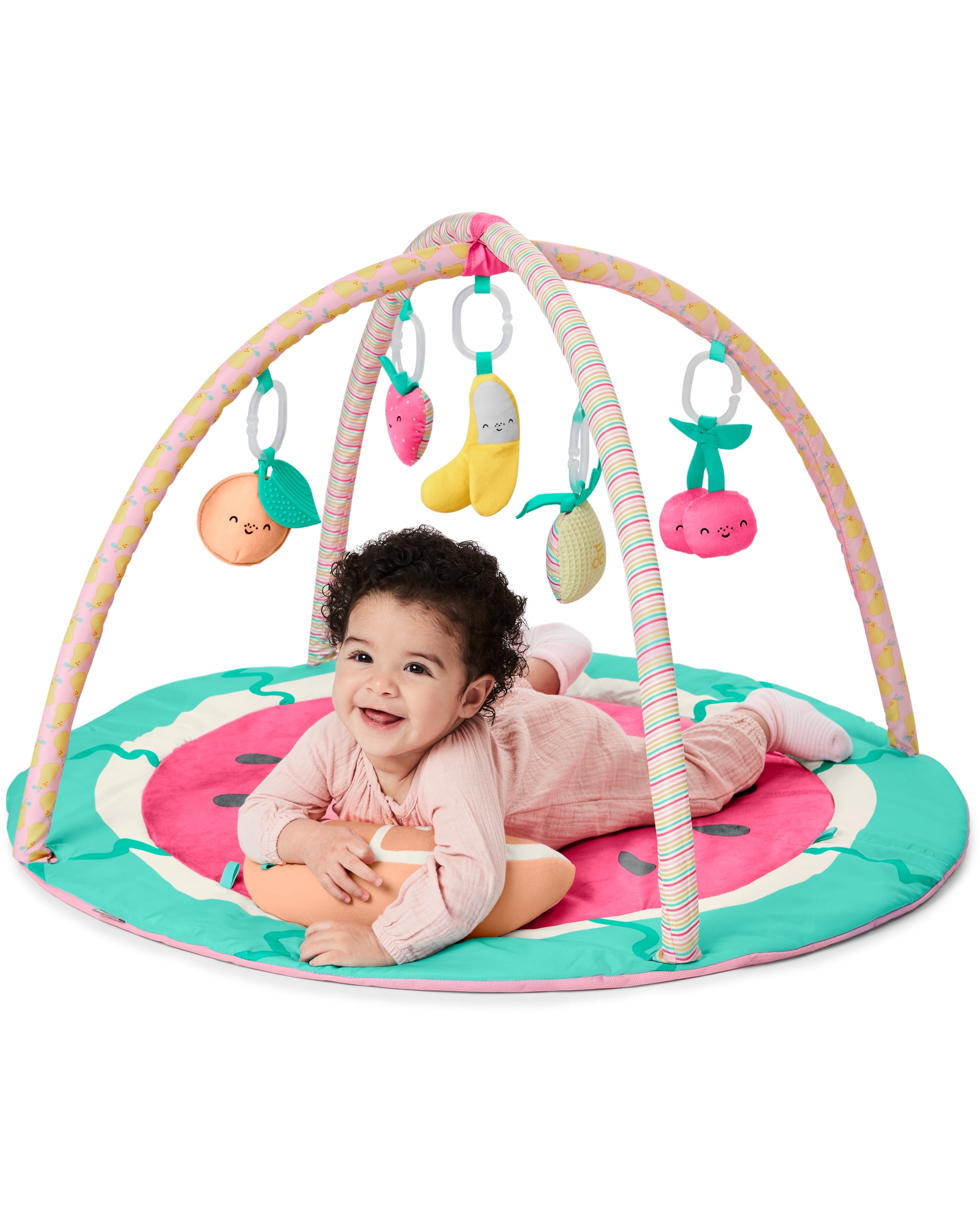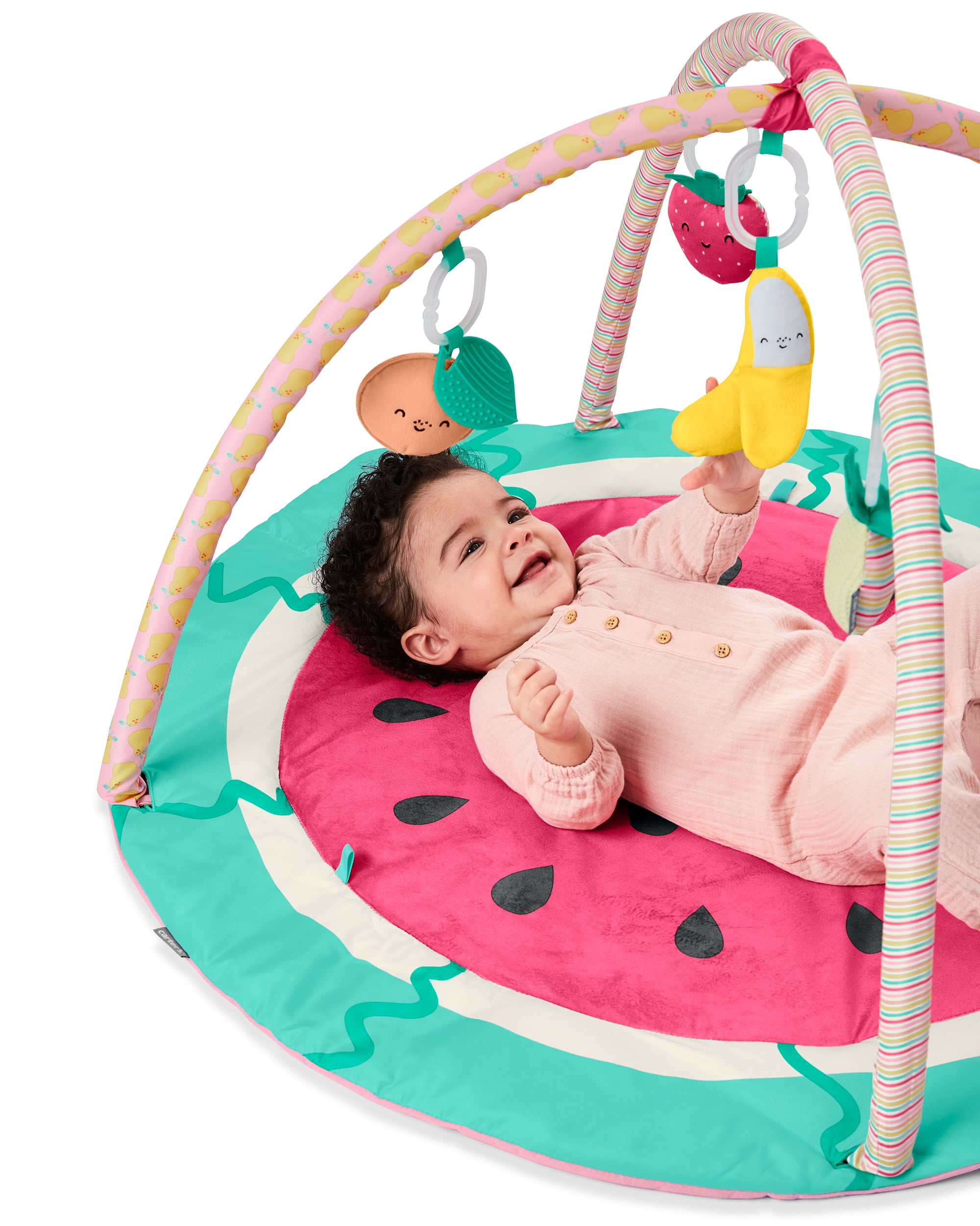 Filled with bright colors and fresh fruity treats, this adorable play gym features a plush watermelon mat and a comfy citrus for tummy time. Five cute hanging toys engage baby with music, rattle sounds, textures and more to explore for playtime learning and fun.