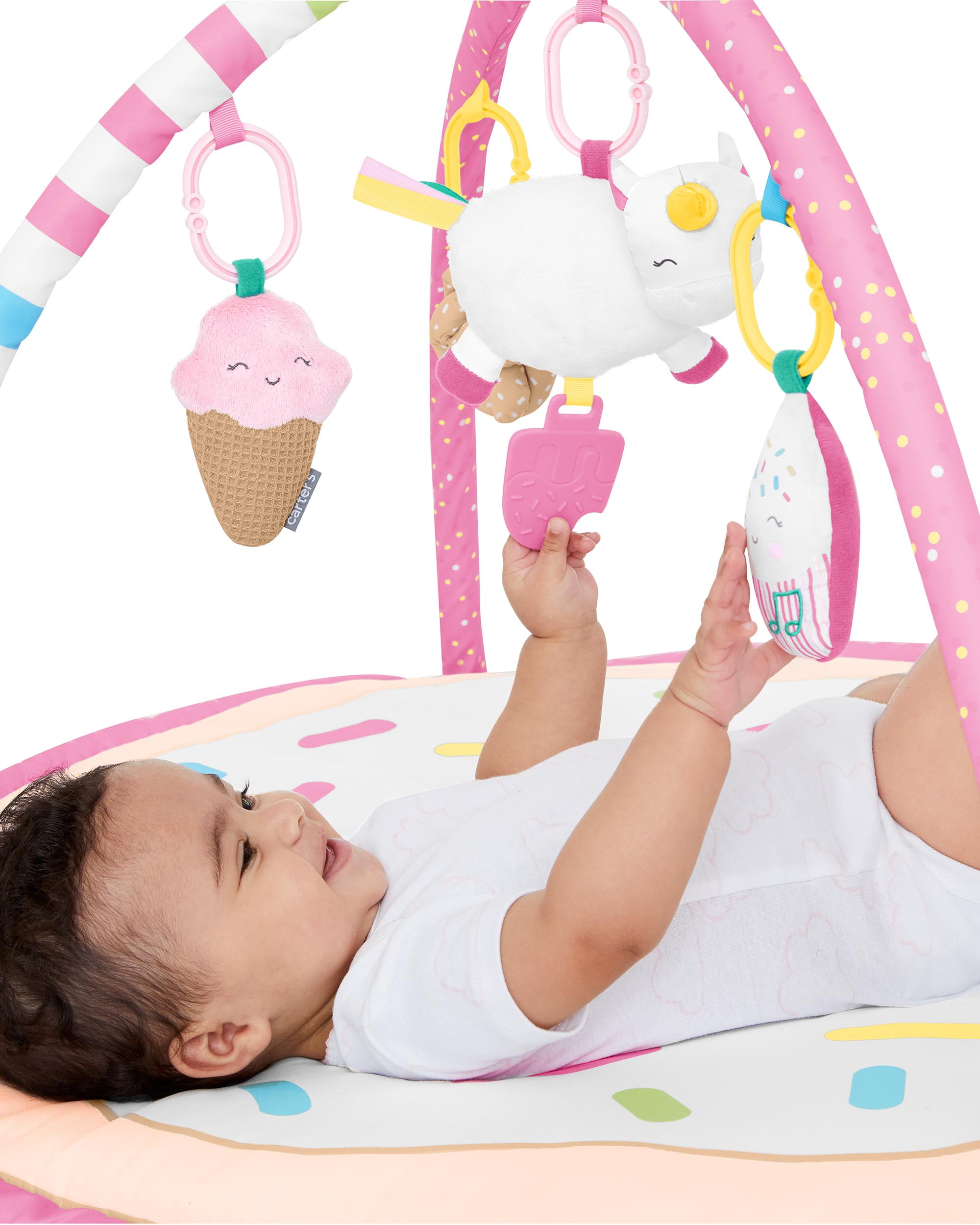 Filled with candy colors and yummy treats, this adorable play gym features a soft donut-shaped mat with a plush center for baby’s comfort. Five sweet hanging toys including a musical cupcake and a lollipop with baby mirror, serve up engaging textures, sounds and more for baby to explore. The cherry on top? A colorful popsicle pillow that’s tailor-made for tummy time play.