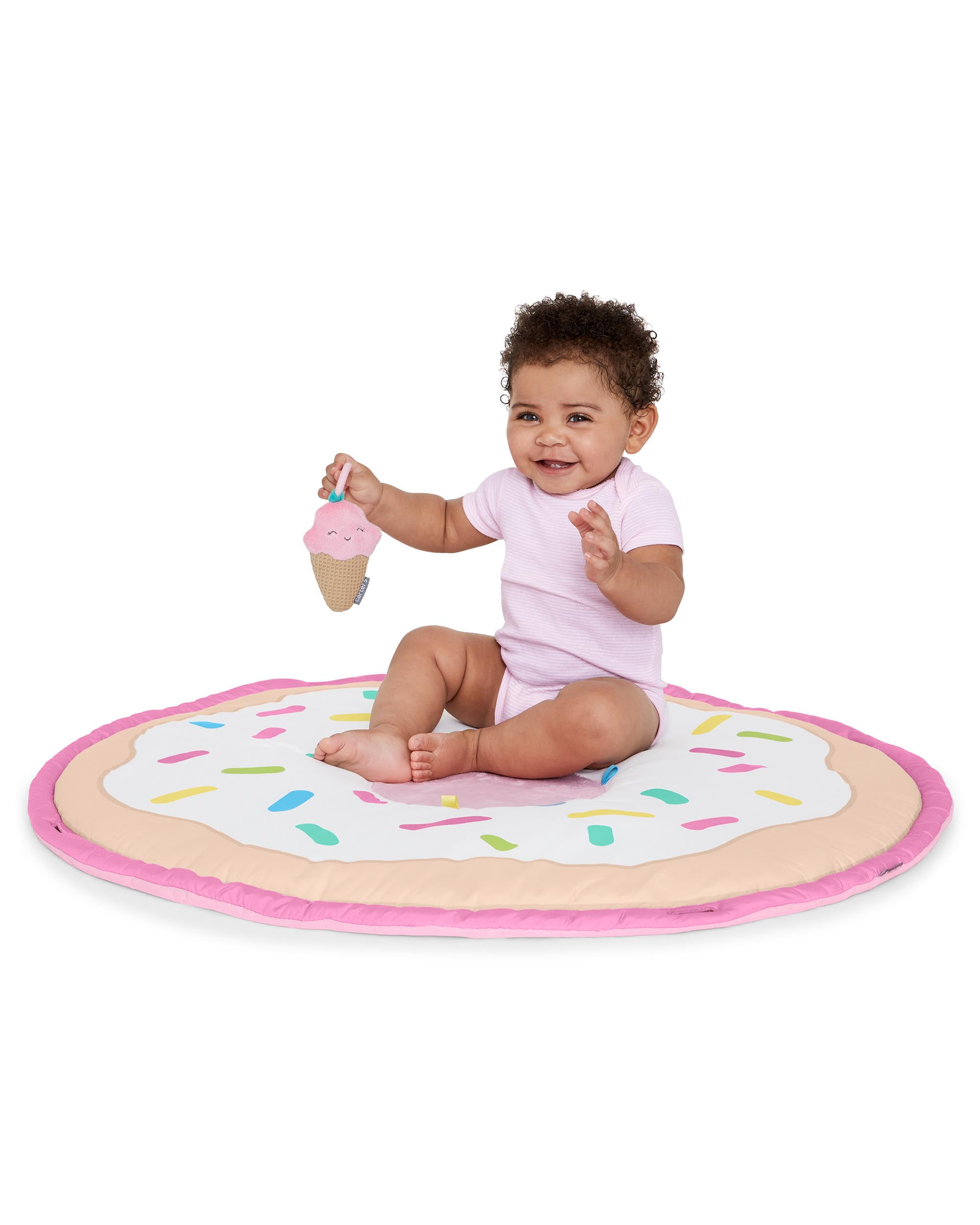 Ages 0+ Three ways to play: Overhead, tummy time and seated Comfy donut-shape mat with plush center Adorable popsicle tummy time pillow Five developmental toys include: Plush unicorn with rattle and popsicle teether toy, musical cupcake, ice cream with crinkle & waffle texture cone, soft tactile pretzel, lollipop with baby mirror PVC-free, Phthalate-free Size (inches): 34l x .75d x 28h; (cm): 86l x 2d x 71h