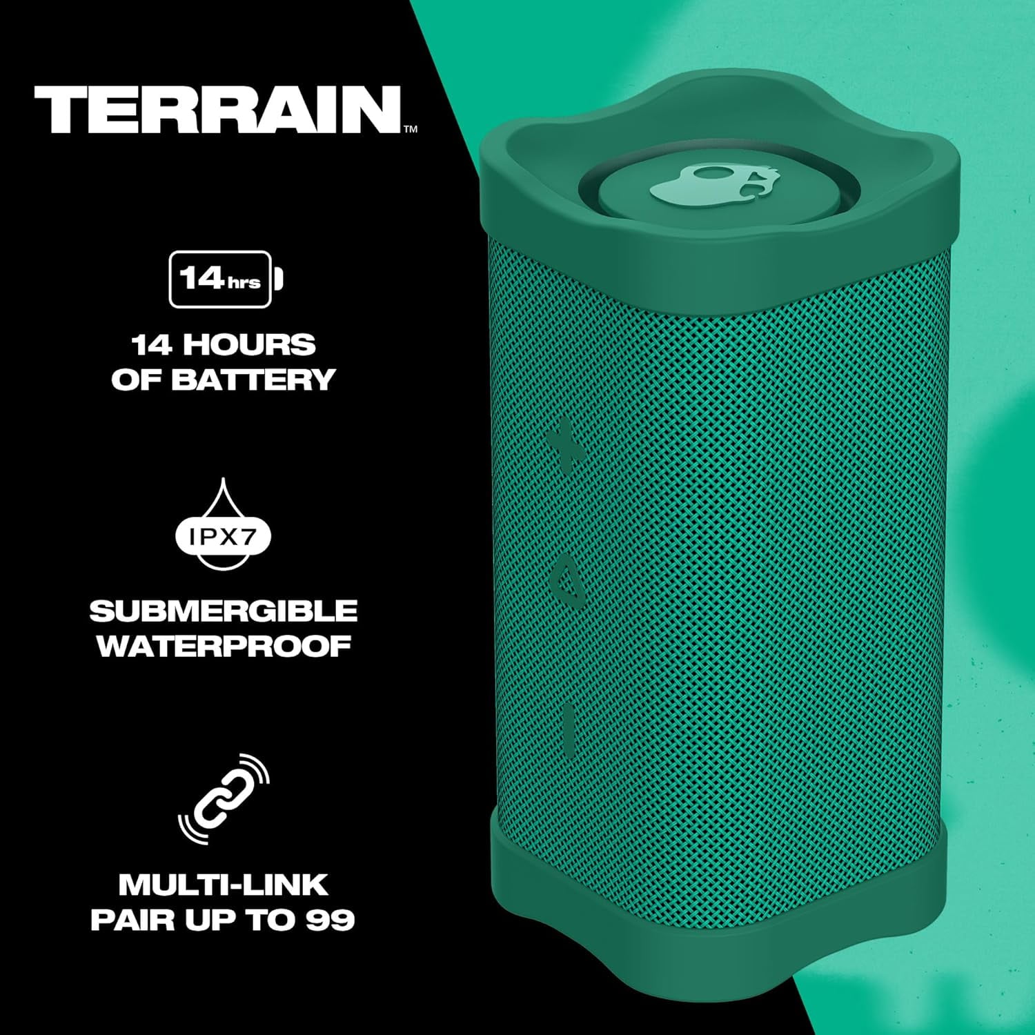 On-the-go audio. Bring big, beautiful sound wherever you go — Terrain is built to handle whatever Mother Nature dishes out. Link two Terrain speakers wirelessly to listen in full stereo or connect up to 99 Skullcandy Multi-Link-enabled speakers to entertain any crowd from 1 to 1000. Worry-free wireless. With impact-resistant construction and an IPX7 waterproof rating, Terrain can take a beating. And with 14 hours of play time, Terrain won’t end the party with an awkward silence. Plenty loud for any crowd. Terrain can wirelessly connect with up to 99 Skullcandy Multi-Link-enabled speakers with a simple press of a button. Just tell your friends to bring their Skullcandy Terrain Mini, Terrain or Terrain XL speakers and your sound system will grow with the guest list.