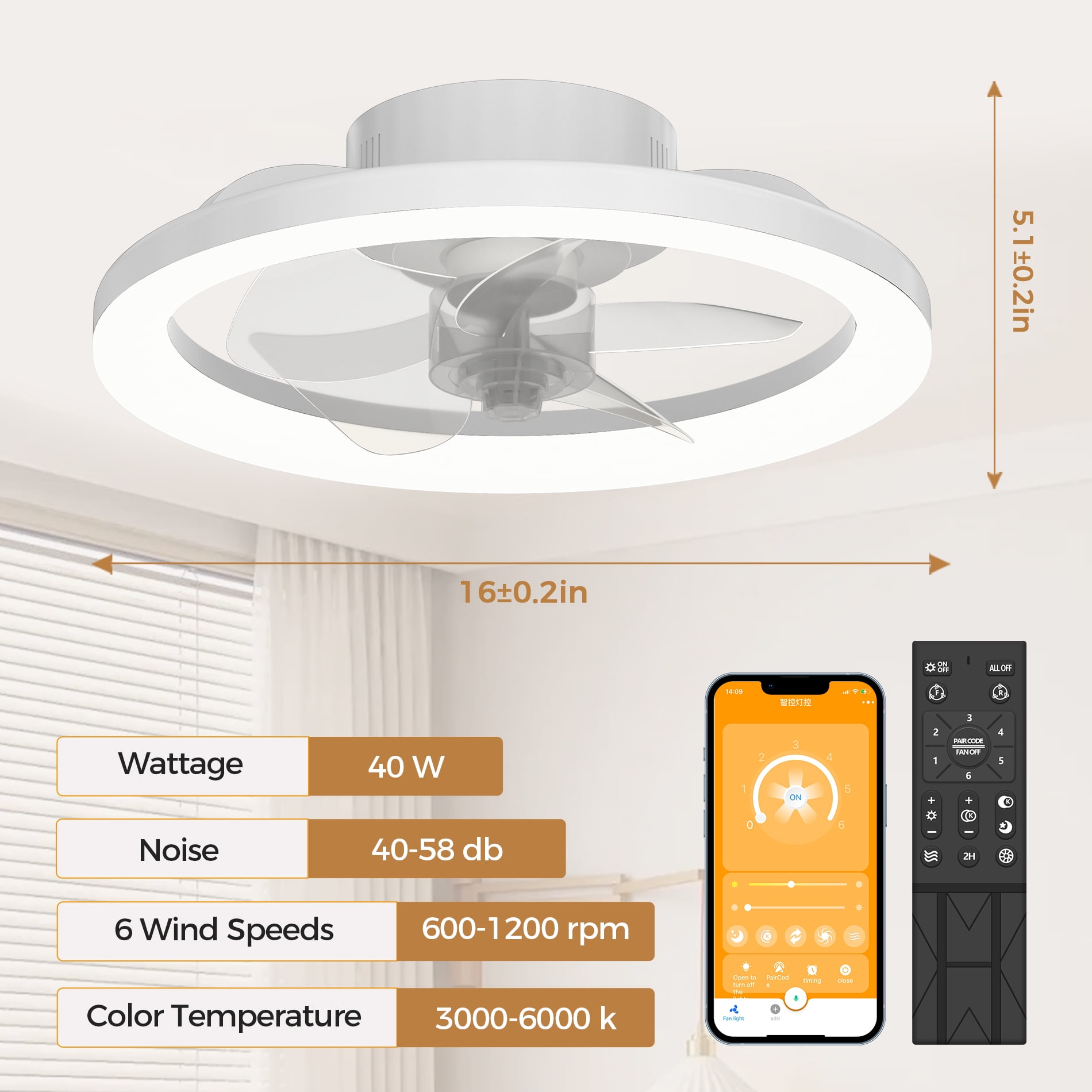 Skvevn 16″ Ceiling Fan for Bedroom, 3 Colors Lighting, 6 Wind Speeds, Remote & APP Control, Modern Dimmable LED Ceiling Fan