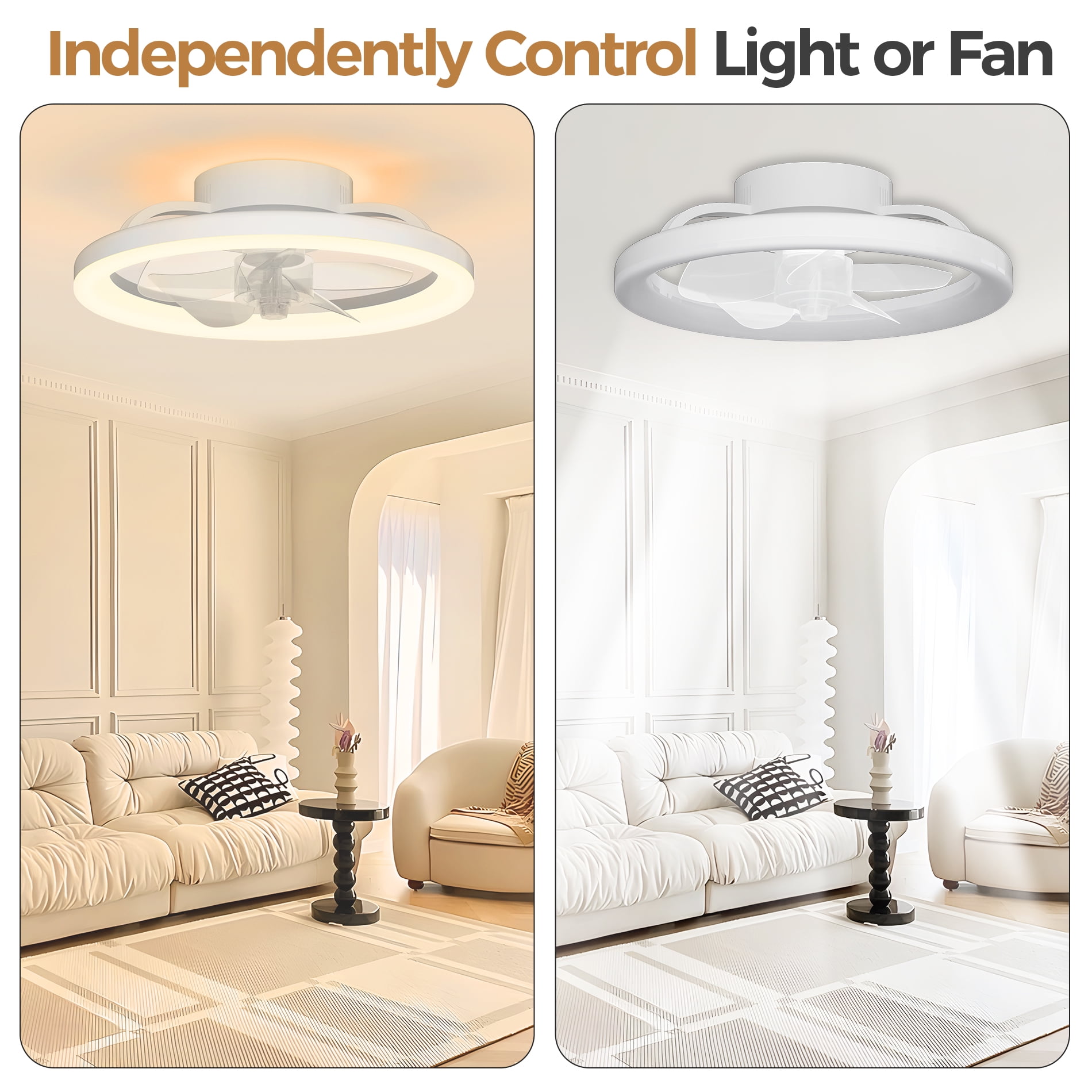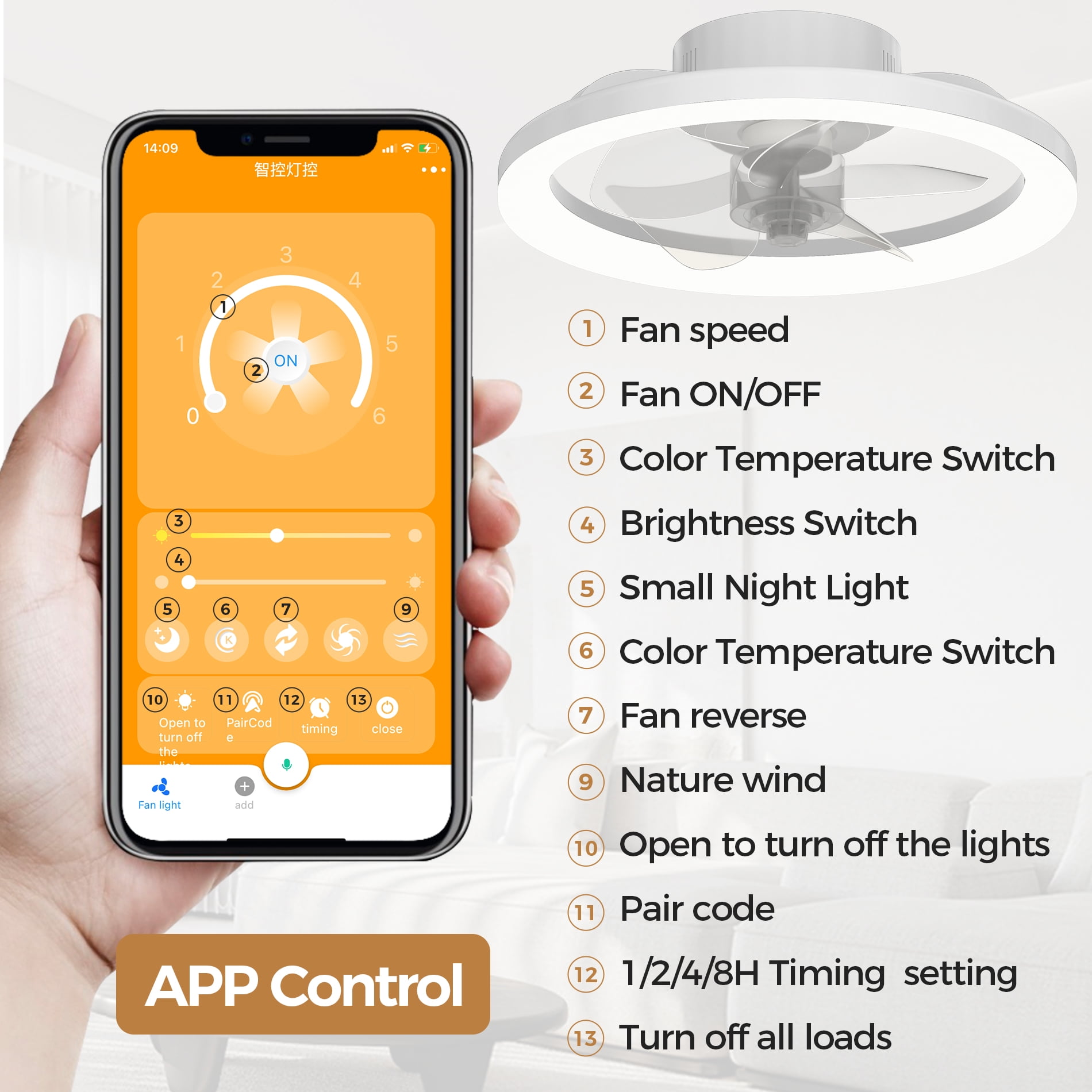 Product details This high quality small ceiling fan with light is great for indoor and outdoor, compact size. Our led ceiling fan has 2 adjustable light colors (white light/natural light) 6 wind speeds are optional, and you can set a timer, all of these functions can be easily controlled with our equipped remote control or App. Specifications: Style: Simple & Modern Style Lighting Power: 24W Light Shape: Round Material: ABS Control Method: Remote Control (Battery Not Included) & app Light Source: White, Natural Dimmable: Yes Timing Setting: 2h Wind speed: 6 Adjustable Wind Speeds Voltage : 110V