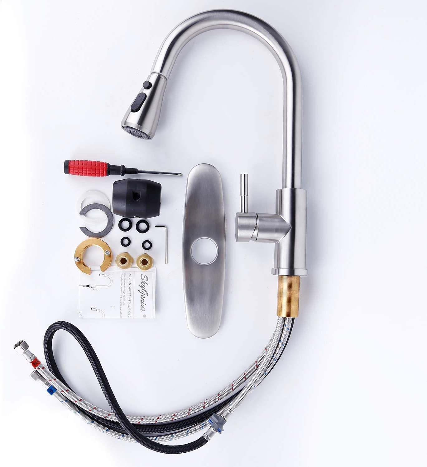 This pull-down, dual action spray head on the SkyGenius Single Handle Spray Kitchen Faucet allows for your choice of stream and spray for all your modern kitchen needs. The faucet is made of pure 304 stainless steel in brushed nickel, brass inner components, ceramic valve. The pull-out sprayer takes 360-degree connector, more flexible and durable. All needed hardware and manual are included in the package. Easy to install with a wrench, NO NEED plumber, save money and time, finish DIY installation less than 30 minutes. Easy to Maintenance: Superior corrosion & rust-resistant finish prevent dirty from sticking to faucet surface.