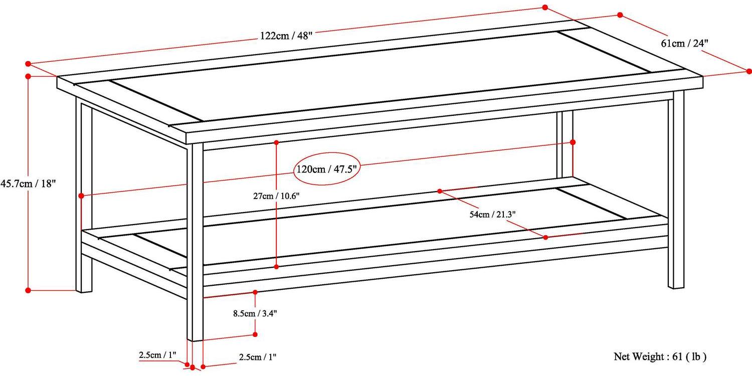 DIMENSIONS:24″D x 48″ W x 18″H Handcrafted with care using the finest quality solid Mango Hardwood & Metal Hand-finished with a Dark Cognac Brown stain and a protective NC lacquer to accentuate and highlight the grain and the uniqueness of each piece of furniture Multipurpose table with storage can be used as coffee or cocktail table. Looks great in your living room great room condo family room or den Industrial design Efforts are made to reproduce accurate colors variations in c