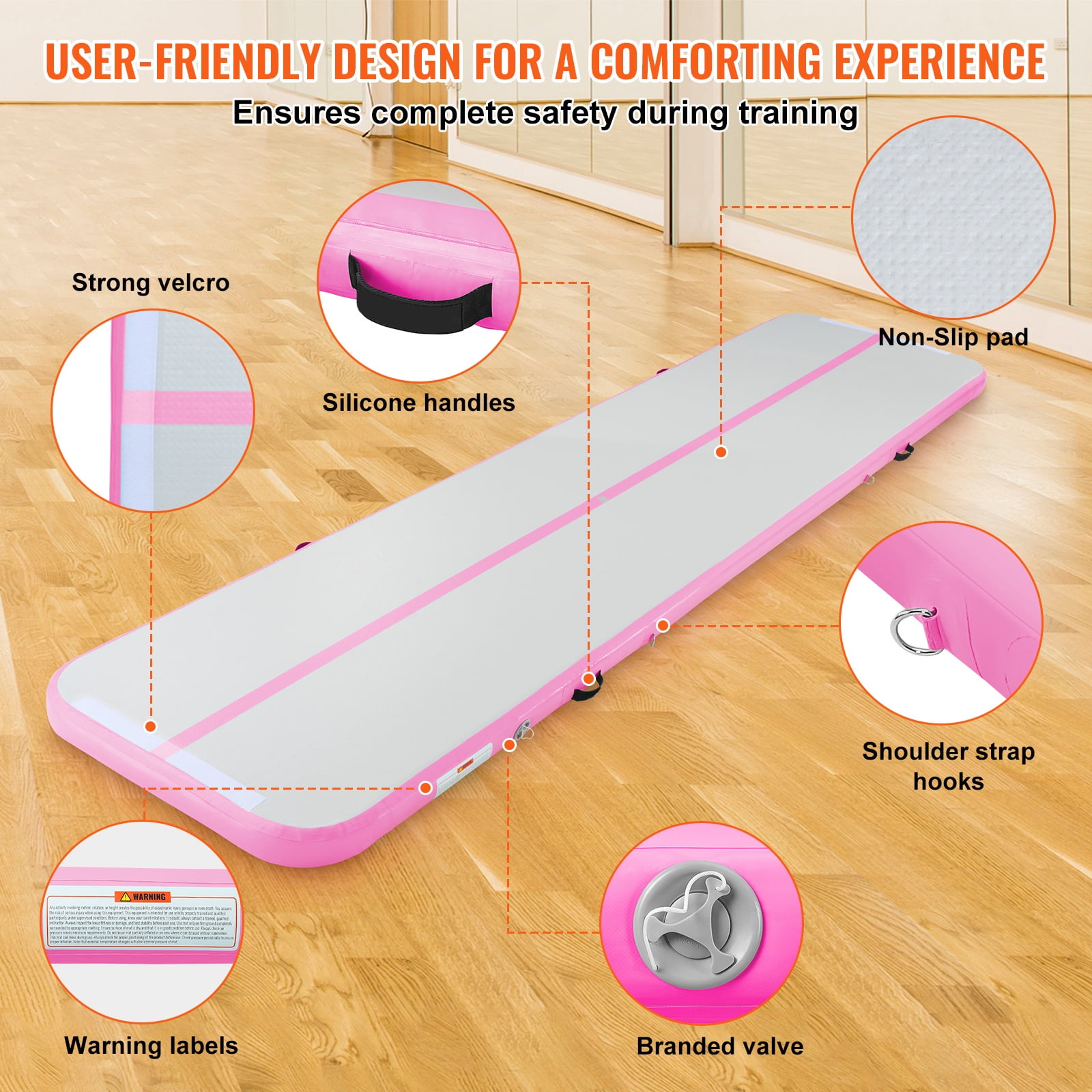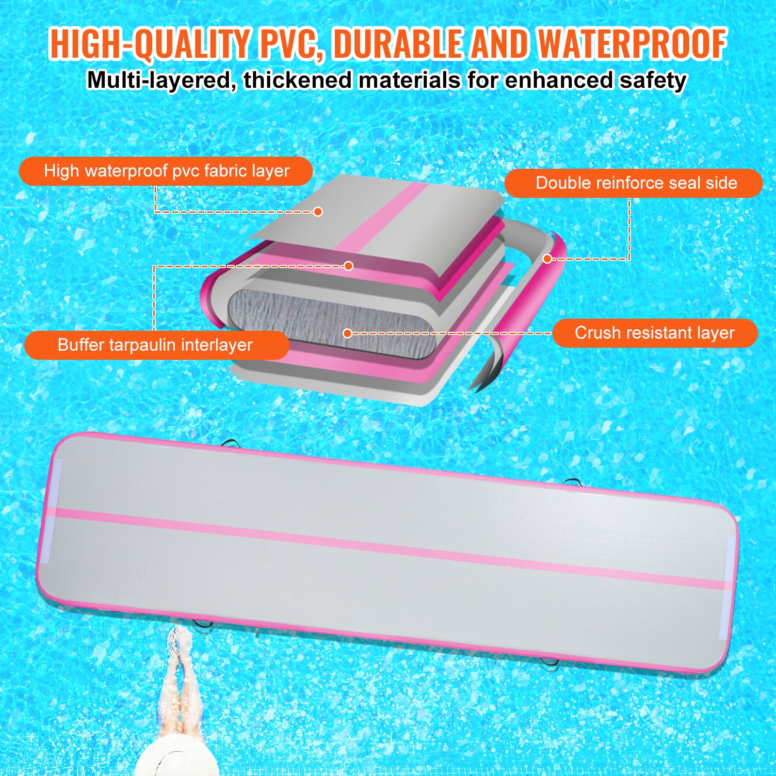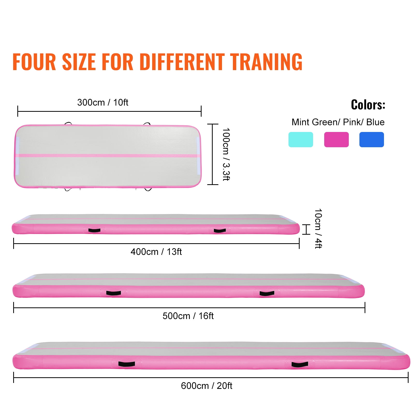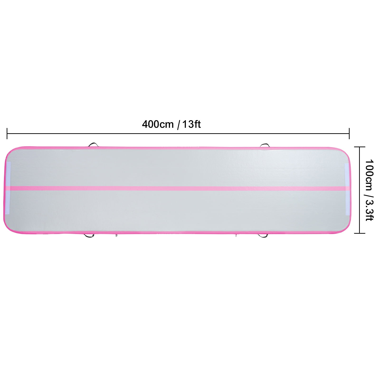 Product Description Multifunctional Tumbling Mat This inflatable gymnastics mat is a soft, highly elastic piece of sports training equipment made from PVC material. It features waterproof, anti-slip, and eco-friendly properties. Its high elasticity ensures protection against injuries during exercises. High-Quality Inflatable Airtrack This inflatable gymnastics mat is a soft, highly elastic piece of sports training equipment made from PVC material. It features waterproof, anti-slip, and eco-friendly properties. Its high elasticity ensures protection against injuries during exercises. Easy to Fold, Simple to Inflate The training mat comes with a 600W electric pump. Inflation or deflation takes less than a minute, airtight for days. Comes with a branded door valve for assured quality, equipped with multiple nozzles and hoses for easy use. A zipper storage bag for more convenient storage. Exquisite Workmanship The tumbling mat is newly upgraded for an even more comfortable user experience. Variety of Colors and Sizes Available in multiple sizes and colors, and easy to assemble. This gymnastics air mat is made from high-quality PVC tarpaulin for enhanced durability. Versatile Applications A multi-purpose mat with various options, suitable for tumbling, gymnastics, yoga, artistic activities, etc. Additionally, our air mat tumble track can be used on the beach, pool, backyard, and lawn – just avoid sharp objects. A Considerate Repair Kit The gymnastics air mat includes various practical accessories that support repairing different parts of the air mat, ensuring comprehensive and easy maintenance. Specifications Item Model Number: TT-M-13-P Color: Pink Product Weight(including all accessories): 13.6 kg / 30 lbs Dimensions: 3980x1010x100 mm / 156.7×39.8×3.9 inches Package Content 1 x Gymnastics Air Mat 1 x Set of Accessories