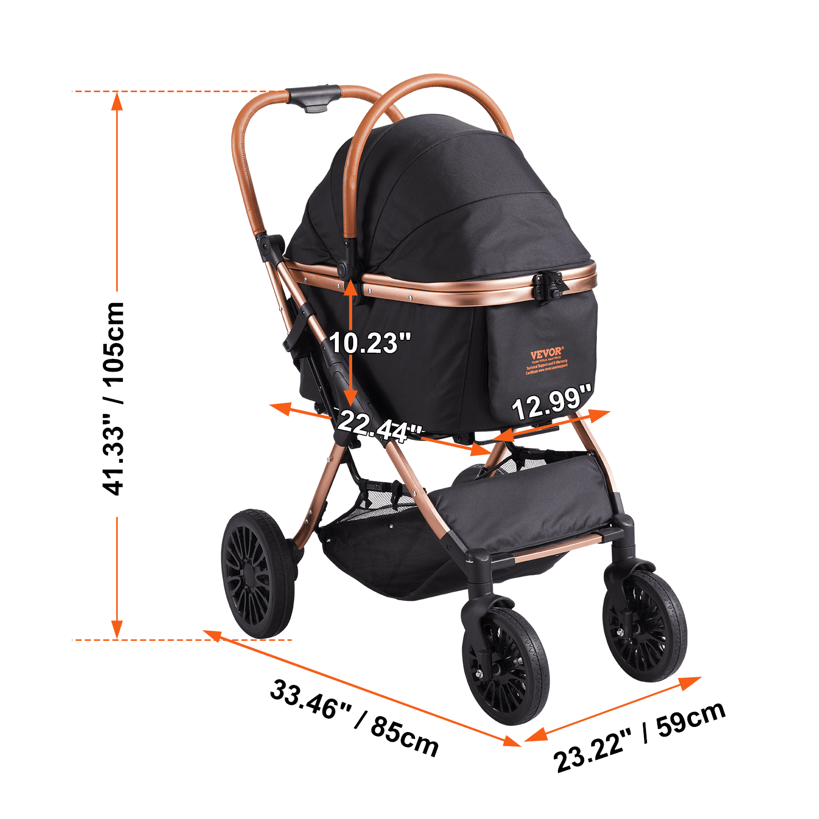 Product Description Multi-functional Three-in-one Design Our multi-functional pet stroller is a three-in-one pet stroller, pet basket and car seat, so you can flexibly choose according to your needs, and easily switch different functions to enhance your travel experience. Large capacity activity space, soft pet sleeping mat, for your pet to provide a more comfortable environment. It can be quickly folded with a single press, and the compact design can be easily placed in the trunk of the car for convenient travel and storage, saving space. Aluminium Alloy Frame Designed specifically for pet travel, this pet cart features a premium aluminum frame to ensure strength, support up to 66 pounds of weight, stability and safety. The surface is coated with rust-resistant powder for extended service life and durability, bringing comfort and safety to your pet whether it is a leisurely walk in the park or a long trip. Flexible PU Large Wheel Our pet strollers have large front 8 inch and rear 10 inch PU wheels, suitable for all kinds of terrain, wear resistance and shock absorbing, ensuring smooth driving and easy coasting. 360° rotation of the front wheel can move forward in a fixed direction, but also easily rotate, providing more flexible and convenient maneuvering operation. The rear wheel is designed with a dual braking system, which can fully protect you and your pet’s safety, just lightly step on the brake, the two rear wheels can be immediately locked, easy operation and emergency response. The thoughtful leather handle design adds convenience to your travel. Comfortable and Breathable Our dog strollers are made of high quality sturdy 800D Oxford fabric, waterproof and durable, no matter how your pet scratches inside, it will guarantee a longer durability, keep your pet safe and comfortable, and increase the use of time. Multiple breathable mesh Windows not only give your pet a wider panoramic view, but also provide good air circulation, avoid mosquito bites, and make pets more comfortable in the car. Spacious Storage Basket The spacious interior of this pet stroller will keep your pet comfortable and secure, while the large storage basket at the bottom can hold many essential pet supplies to meet your storage needs. A built-in safety leash ensures better protection for your pet, providing peace of mind for every trip. User-friendly Design The quick folding feature of our dog stroller saves a lot of space, while the leather handle ensures a comfortable push. Removable carrier for easy disassembly and use into a pet basket, can easily be used as a travel carrier to take off. It can also be a car seat when you are sitting in the car. Every detail is designed to give you a perfect travel experience. Handling Height The handles of our pet strollers come in a variety of height Settings and can be adjusted as you wish. Regardless of your height, you can find the most comfortable push position, meet the needs of personal comfort and adapt to the rotation of different family members to provide you with the best pushing experience. Specifications Item Model Number: G10A Style: Standard – 4 Wheels (Front Single, Rear Single) Color: Black Weight Capacity: 66 lbs/30kg Fabric Material: 800D Oxford Fabric Mesh Window Material: Nylon Wheel Material: PU Front Wheel Size: 8″ Rear Wheel Size: 10″ Brake Type: Link Brake (rear wheel) Frame Material: Aluminum Alloy Bottom Plate Material for Basket: Reinforced Panel Product Weight: 10.1kg/22.27 lbs Package Content 1 x Pet Stroller 1 x Sleep Pad