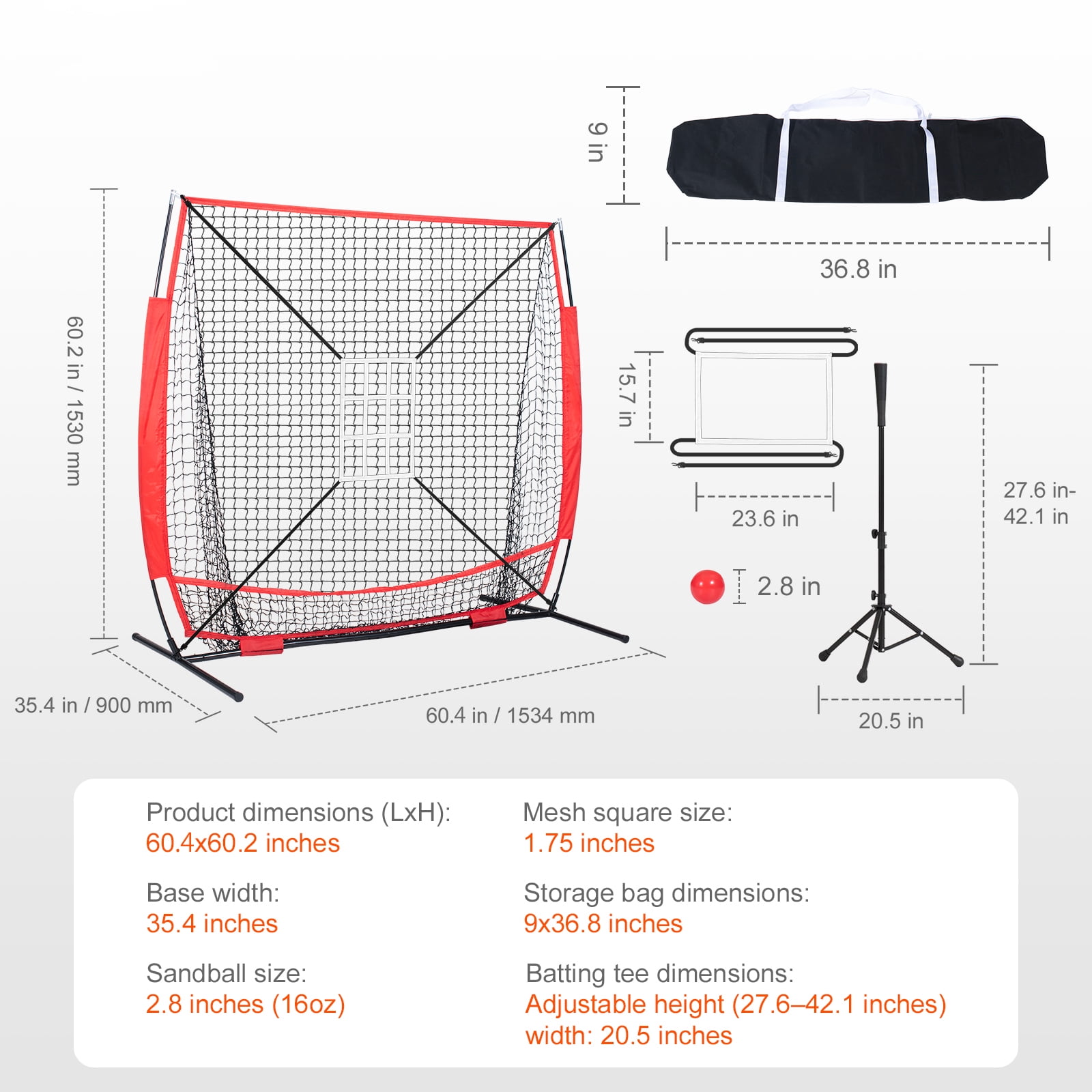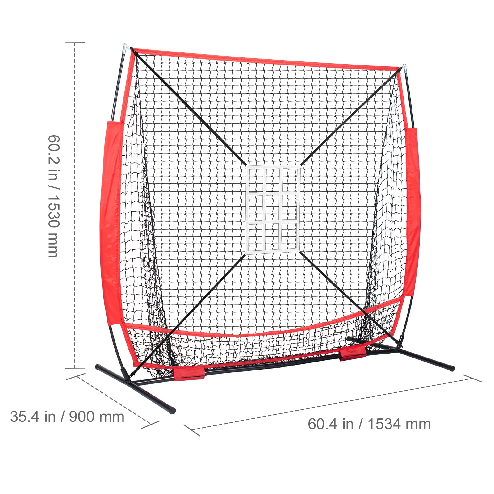 Product Description Hitting Batting Catching Pitching Training Net Our baseball net provides a superior training experience. This frame enhances hitting accuracy, and minimizes excess motion. This kind of training allows players to quickly master fundamental baseball skills and improve their ball responsiveness and control. Target Frame Our baseball net provides a superior training experience. This frame enhances hitting accuracy, and minimizes excess motion. This kind of training allows players to quickly master fundamental baseball skills and improve their ball responsiveness and control. Thickened Fiberglass Rod Our fiberglass rods, with a diameter of 12.7mm, offer higher strength, elasticity, and weather resistance. They can be used outdoors for extended periods without signs of aging or becoming brittle, resulting in longer service life and low maintenance costs. Sand-Filled Ball The sand-filled ball is heavier than a regular baseball and is primarily used in training to increase a player’s hitting power and throwing speed. Its design helps players enhance their muscle strength and throwing techniques. Suitable for players of all levels. Sturdy 600D Storage Bag This 600D storage bag can bear more weight and withstand wear and tear. Additionally, it possesses excellent weather-aging resistance and is resistant to chemical corrosion, oxidation, and is flame-retardant, providing better stability, durability, and a longer lifespan. Installation Precautions 1. Before installation, please read the manual, as incorrect assembly can lead to damage. 2. This net contains small parts, not suitable for children under 3 years of age. 3. Avoid pinching when installing joint parts. 4. Do not climb or pull violently. 5. Regularly inspect the training net. Carbon Steel Connection Base The base is sturdy and durable. The support pipes and connectors are made of carbon steel, making it robust and resistant to deformation. It can withstand ball impacts. Furthermore, its rust-resistance and anti-corrosion properties ensure it doesn’t easily age or crack when used outdoors. Specifications Item Mode Number: YC-SS-BN001 Base Size(LxW): 60×35.4 inch Net Weight: 11.5 lbs / 5.2 kg Net Material: Polyester Package Content 1 x Baseball softball practice net 4 x Anti-tip ground stakes 1 x 600D storage bag 1 x 2.8-inch red 16oz sand-filled ball 1 x Nine-grid target frame 1 x Square target frame 1 x Batting tee (tee-02) 1 x Instruction manual