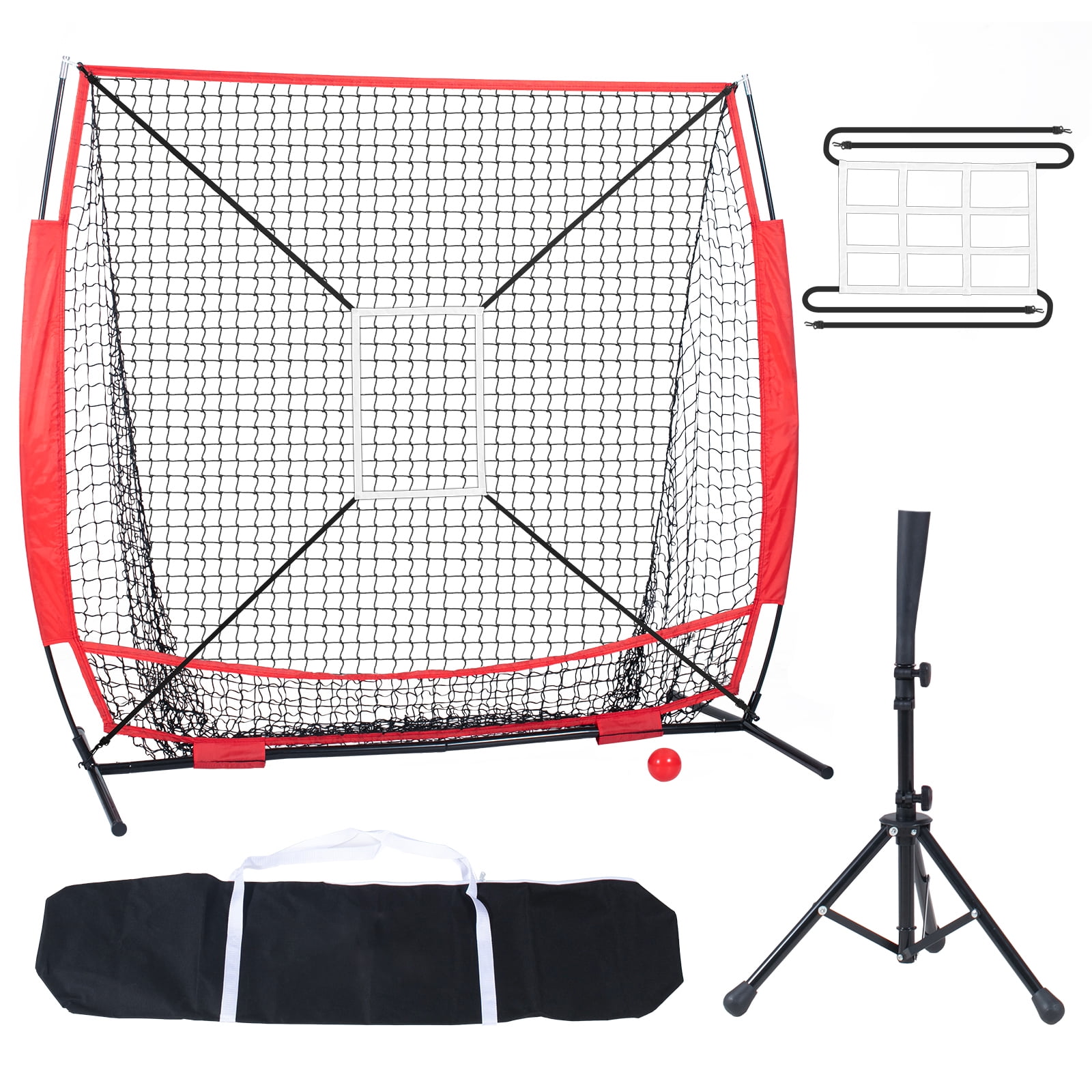 5x5ft Training Set: Beyond the basic net and support frame, this baseball softball practice net set also includes a square and nine-grid target frame, a tee stand, and a 2.8-inch sand-filled ball. Furthermore, it comes with a specialized storage bag for quick and easy packing. Suitable for both baseball and softball, the comprehensive accessories allow players to effectively practice pitching and catching, leading to rapid skill enhancement. Sturdy & Anti-Tipping Design: The supporting rods are crafted from 12.7mm thick fiberglass, boasting superior strength, flexibility, and weather resistance. Paired with a carbon steel support base, its robust structure offers powerful weight-bearing capabilities. This practice net for hitting and throwing resists aging and brittleness, ensuring a longer lifespan. Ideal for prolonged outdoor use! Tough & Wear-Resistant Netting: The baseball net is woven from high-strength, wear-resistant synthetic fibers like polyester and nylon. Its knotless weave renders a smooth and even surface, minimizing wear and breakage from ball-to-net friction. This results in a net that retains its shape over time and guarantees both high strength and durability. Enhanced Batting Training: The adjustable tee stand ranges from 27.6 to 42.1 inches, accommodating both adults and children. Paired with a 16oz sand-filled ball, it aids players in honing and enhancing their muscle strength and throwing techniques. Suitable for players of all skill levels, from beginners to seasoned pros. Dedicated Portable Storage Bag: Made from 600D Oxford fabric, its coarser and thicker weave offers superior wear resistance, enabling it to bear greater weights and wear. Additionally, it exhibits excellent resistance to weathering and aging, coupled with properties like chemical corrosion resistance, oxidation resistance, and flame retardancy. This results in a bag with enhanced stability, durability, and a prolonged lifespan.
