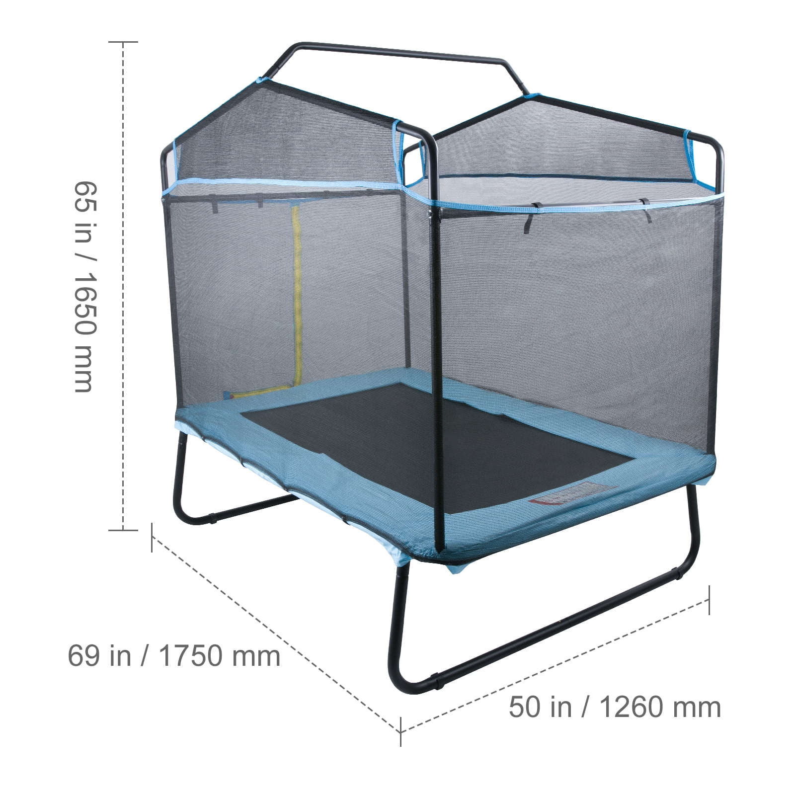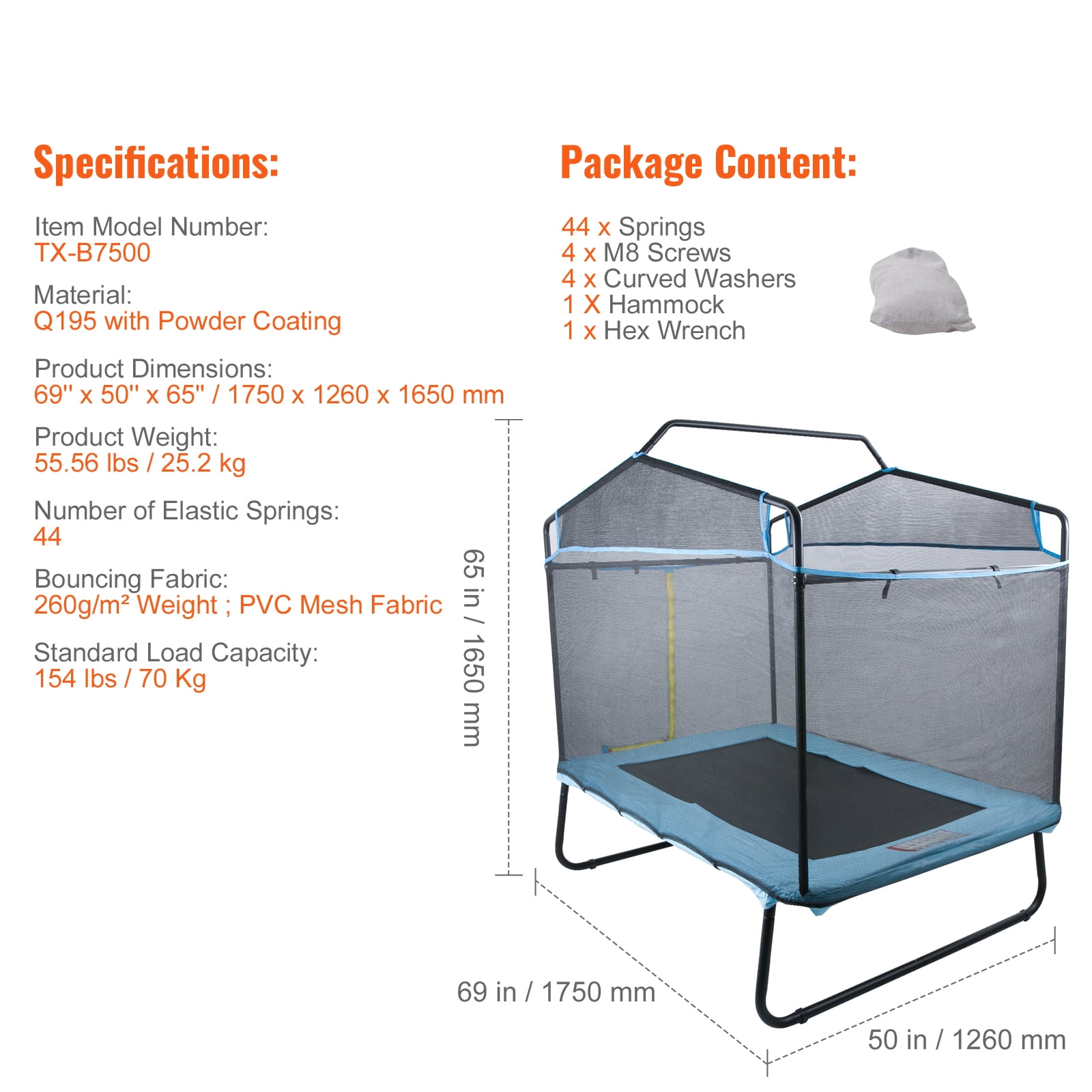 Product Description SKYSHALO 6FT Trampoline for Kids Encourage your child’s growth with the SKYSHALO 6′ Kids Trampoline, a fun-filled way to develop health and coordination. The upgraded metal frame, 360° case security and thick foam padding make for a safe adventure. It provides non-stop indoor or outdoor entertainment with a variety of gaming options. Sturdy Steel Frame Made from sturdy Φ0.98″ steel tubing, 0.06″ thick for ultimate durability. Energetic Bouncing The flexible jumping mat offers excellent bounce for hours of active fun. Safety Priority Seamless padding, spring protection and waterproof PP material ensure maximum safety. Weight Capacity Premium springs provide stability and support for your child’s safe bouncing experience. Versatile Play Ideal for indoor and outdoor use to promote a healthy, active lifestyle. Effortless Setup Easy one-player sessions, precise alignment, and instant gaming enjoyment. Specifications Item Model Number: TX-B7500 Material: Q195 with Powder Coating Product Dimensions: 69” x 50” x 65” / 1750 x 1260 x 1650 mm Product Weight: 55.56 lbs / 25.2 kg Number of Elastic Springs: 44 Bouncing Fabric: 260g/m² Weight ; PVC Mesh Fabric Standard Load Capacity: 154 lbs / 70 Kg Package Content 1 x Trampoline for Kids 44 x Springs 4 x M8 Screws 4 x Curved Washers 1 X Hammock 1 x Hex Wrench