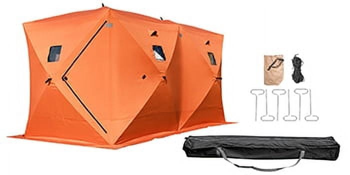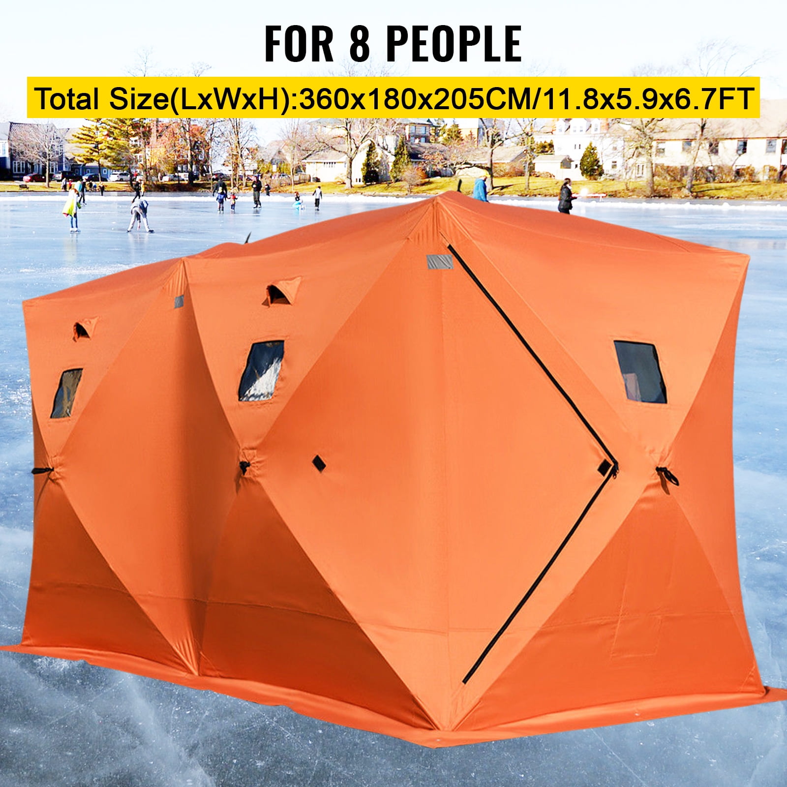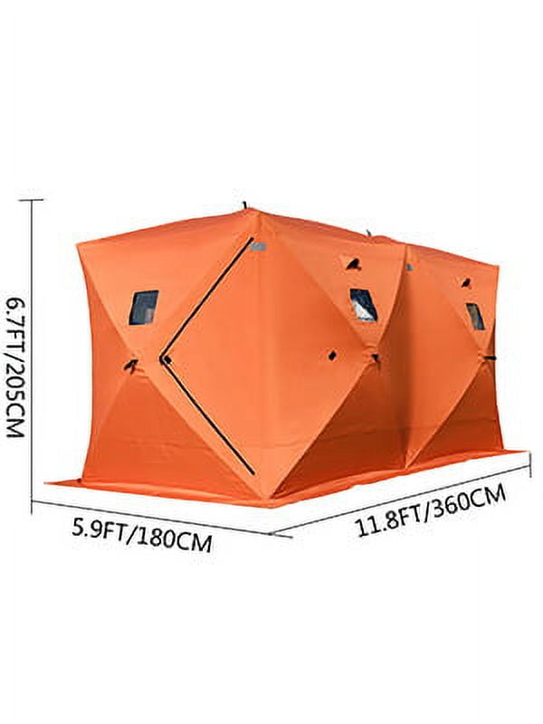 【60 SECONDS SET UP】- This ice fishing tent with hub design comes fully assembled and can be easily set up in 60 seconds. All you need to do is to pull out each side and the roof hub. The tent is tightly fixed in the ground by self-tapping ice anchors, which are easy to grip and won’t bend under pressure. 【DURABLE 300D MATERIAL】- Our ice fishing shelter is durable, stable, waterproof, and resistant to cold, wind, and rain thanks to its 300D Oxford fabric. Solid fiberglass poles ensure high stability during use. 【WITH ONE CARRY BAG】- We offer you one carry bag for easy transport and storage. After folded, the tent fit perfectly in the included bag for you to carry away. Tent Net Weight: 29 lbs/13.2 kg. Carry Bag(L x W x H): 130 x 25 x 25 cm/4.2 x 0.8 x 0.8 ft. 【8-PERSON TENT】- Our ice shelter with ample room is large enough to accommodate 8 people. The wide-bottom design provides a significantly fishing area for you and your friends. Unfold Size: 360 x 180 x 205 cm/11.8 x 5.9 x6.7 ft. This ice fish shelter is suitable for outdoor use, such as expedition, fishing, night fishing, winter fishing, camping, hiking. 【HUMANIZED DESIGN】- Two doors with double head zippers can be fixed on the tent. Two air vents ensure great ventilation. 2-layer detachable windows allow for best vision, one layer is oxford, one is transparent PVC. 8 web handles for easy setup and moving. Built-in mesh pockets for easy storage.