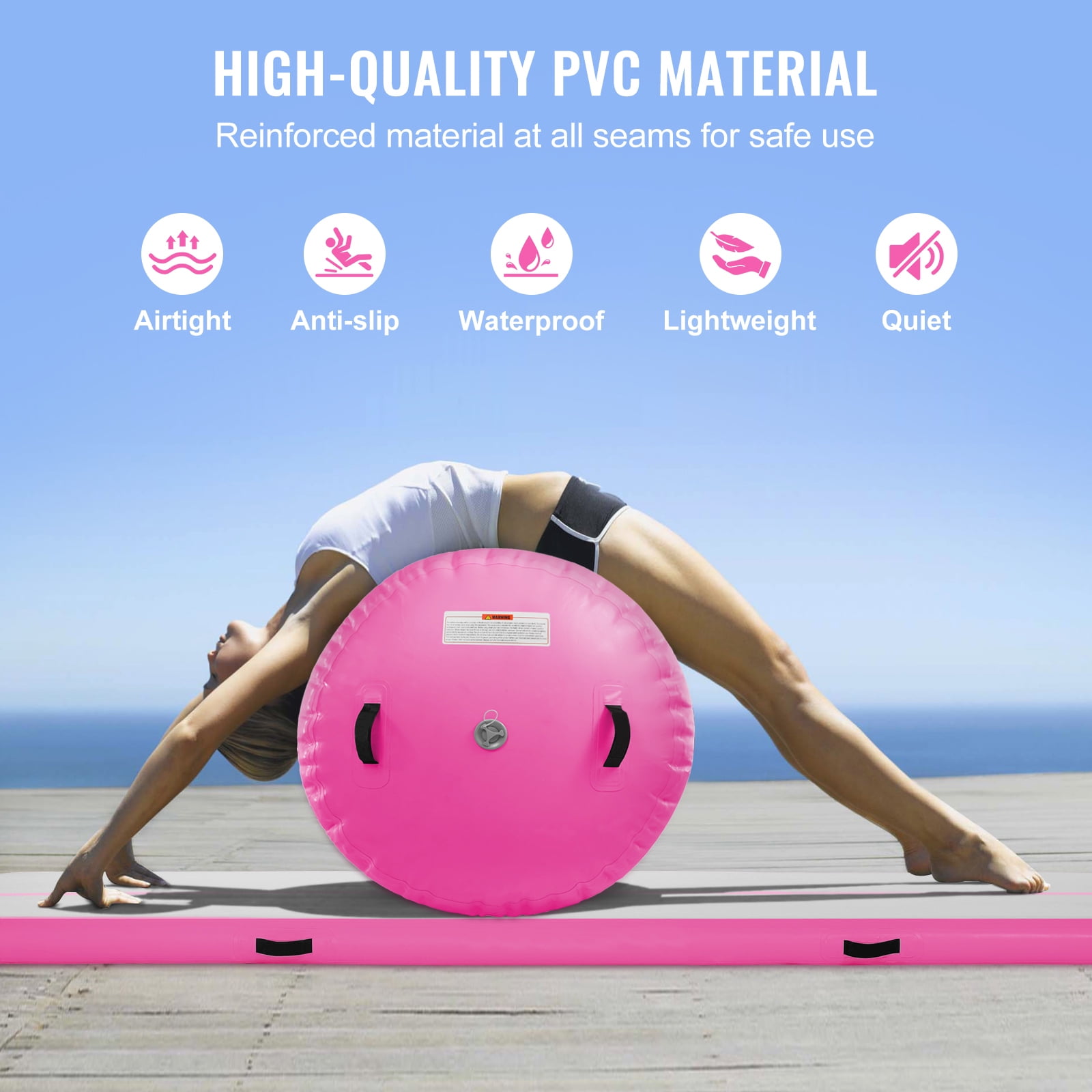 Product Description Multifunctional Tumbling Mat This inflatable gymnastics mat is a soft, highly elastic piece of sports training equipment made from PVC material. It features waterproof, anti-slip, and eco-friendly properties. Its high elasticity ensures protection against injuries during exercises. High-Quality Inflatable Airtrack This inflatable gymnastics mat is a soft, highly elastic piece of sports training equipment made from PVC material. It features waterproof, anti-slip, and eco-friendly properties. Its high elasticity ensures protection against injuries during exercises. Easy to Fold, Simple to Inflate The training mat comes with a 600W electric pump. Inflation or deflation takes less than a minute, airtight for days. Comes with a branded door valve for dependable quality, multiple nozzles, and hoses for ease of use. Includes a storage bag for convenient storage. Exquisite Workmanship The tumbling mat is newly upgraded for an even more comfortable user experience. Complete Inflatable Gymnastics Mat Set It is suitable for professional training or competitive exercises. The small tumbling mats are perfect for indoor and outdoor family entertainment or leisure exercises. Choose different air mats for training according to your needs to boost your resistance. Versatile Applications A multi-purpose mat with various options, suitable for tumbling, gymnastics, yoga, artistic activities, etc. Additionally, our air mat tumble track can be used on the beach, pool, backyard, and lawn – just avoid sharp objects. A Considerate Repair Kit The gymnastics air mat includes various practical accessories that support repairing different parts of the air mat, ensuring comprehensive and easy maintenance. Specifications Item Model Number: TT-M-40-24-10 Color: Pink Product Weight(including all accessories): 13.2 kg / 29.1 lbs Tumbling Roller Dimensions: 600×1230 mm / 23.6×48.4 inch Tumbling Mat Dimensions: 3000x1010x100 mm / 118.1×39.8×3.9 inch Package Content 2 x Gymnastics Air Mat 1 x Set of Accessories