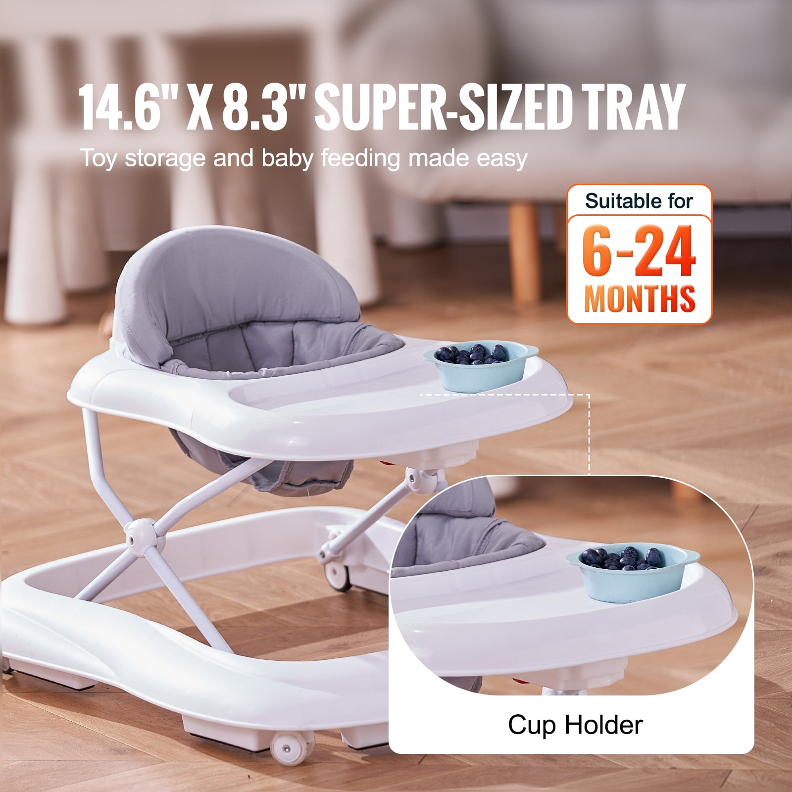 Boost your baby’s development with the SKYSHALO baby walker, an ideal companion to cultivate walking skills and muscle strength. With a stable structure, adjustable height, and convenient folding, our walker effortlessly adapts to your baby’s evolving needs while ensuring endless enjoyment and safety 3-Level Adjustable Height: Our folding baby walker offers 3 adjustable heights, scientifically preventing the O-shaped legs and maintaining proper posture during walks, with options of 13.4 inches, 14.2 inches, and 15.0 inches. Easy to Move: 4 smooth-rolling wheels provide flexible and smooth steering to prevent jamming and tipping over, gliding silently without disturbing others and without scratching the floor. With 6 anti-skid blocks assisting in braking, your baby can walk confidently and securely. High Quality & Healthy Material: Your baby’s safety and health are our top priorities. Crafted from child-friendly PP material, our activity center is BPA-free and odorless, ensuring a safe and pleasant experience. The smooth surface feels gentle to the touch, providing peace of mind for moms and joyful growth for babies. Easy Folding For added convenience, our anti-rollover infant walker features an easy fold mechanism. Quickly fold it down to save space under the sofa or bed, making storage hassle-free. This practical design saves you space and allows your baby to explore freely at home. Enhanced Stability: Our baby walker features a sturdy design with enhanced stability, providing added security. Easy Mobility: Our baby walker features smooth-rolling wheels, allowing your little one to move around freely and explore their surroundings with ease. Let them take their first steps confidently while having fun!