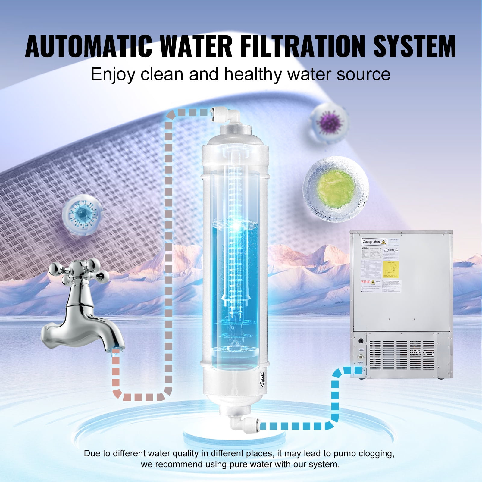- Make Cleaning a Breeze: Our ice machine comes with a one-touch self-cleaning function and a supplied water filter in the inlet pipe. Say goodbye to worries about impurities in your ice. Our state-of-the-art filtration system removes any unwanted particles, ensuring that only pure, clean water is used. It’s not just ice – it’s ice you can trust!