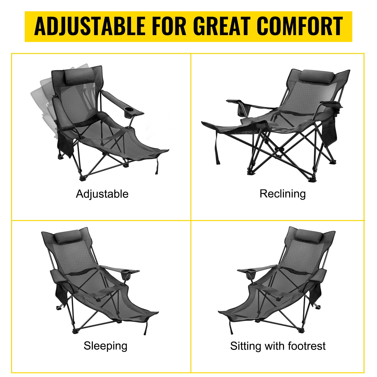 Product Description Folding Camp Chair With Footrest The gray reclining folding camp chair, mesh lounge, beach chaise, features with footrest, is more wider and more comfortable than other chairs. It’s shows off a powder coated steel frame and folds easily for stowing and towing. Sloping backrest design provides firm and comfortable support for the back and legs. Made of high quality Oxford cloth and mesh, durable and reliable, the chair is suitable for outdoor activities, home and offices. Breathable Mesh Our adjustable folding camp chair is made of high quality Oxford cloth and mesh for cooling, durable and reliable, wider and more comfortable than other chairs. Mesh footrest for fully relaxation. Cup Holder and Storage Bag Built-in cup holder in the right armrest is the perfect place to place a drink. Built in side pocket on left side of chair is great for holding your magazines, books, or newspapers. Adjustable Heights The camping lounge chair’s tilt can be adjusted to two different positions, giving you comfortable relaxing ways. You can choose to sit up or lounge on this adorable lounge chair. And it comes with a headrest to give you a more comfortable experience. Max. Capacity 150kg This reclining camp chair is made of high quality steel, very stable, maximum load capacity: 150 kg (330 lbs). But the recliner itself only weighs about 10 pounds and comes with a carrying bag, making it easy to carry and enjoy time and life freely anytime, anywhere. Easily Assembled The reclining chair comes fully assembled, is convenient for using, can fold compactly when not in use for easy storage. Powder coated steel frame folds easily. Wide Application The mesh reclining folding camp chair is ideal for camping, self-driving tour, fishing and other outdoor activities.It also can be used as a nap chair in office or garden. Specifications Color: Gray Fabric: 600D Oxford Cloth & Mesh Fold Size: 18 x 18 x 89 cm (7.09 x 7.09 x 35.04 inch) Unfolded Size: 168 x 56 x 69 cm (66.14 x 22.05 x 27.17 inch) Rated Capacity: 110 kg (242.5 lbs) Max Capacity: 150 kg (330 lbs) Package Size: 91 x 20 x 20 cm (35.83 x 7.87 x 7.87 inch) Gross Weight: 4.62 kg (10.19 lbs) Package Content 1 x Adjustable Folding Reclining Chair 1 x Carrying Bag