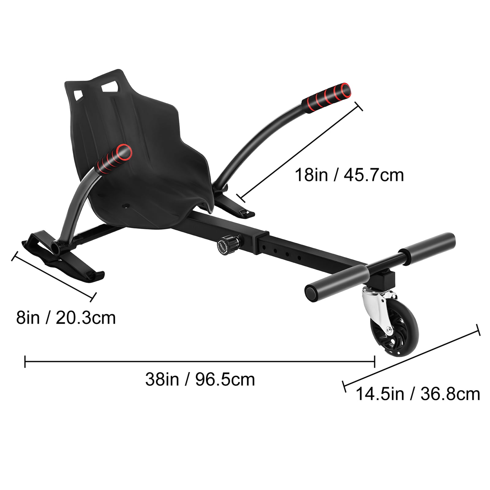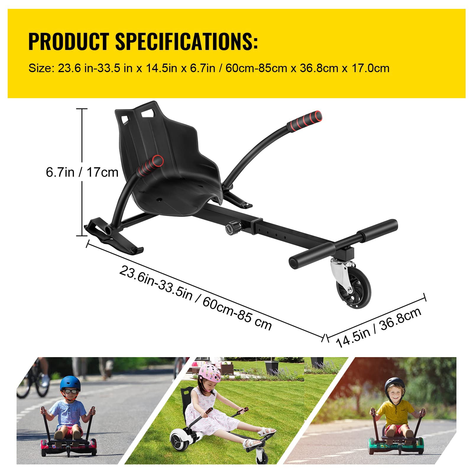 Product Description SKYSHALO Hoverboard Seat Attachment Experience the thrill of outdoor adventures with the SKYSHALO Hoverboard Seat Attachment. Designed to fit 6.5″, 8″, and 10″ hoverboards, this attachment is perfect for riders of all ages, from 4 to 65 years old. With a maximum weight capacity of 220 lbs, it ensures a secure and comfortable ride for everyone.The adjustable length of 23.6″-33.5″ allows you to customize the seat attachment according to your preference, providing optimal comfort and control. Whether you’re cruising through the neighborhood or exploring new terrains, this hoverboard seat attachment guarantees a smooth and exciting ride.Equipped with a 360° wheel, you can effortlessly maneuver in any direction, giving you full control over your hoverboard. It offers a thrilling and immersive experience, making it an ideal gift for kids and adults alike.Not only does the SKYSHALO Hoverboard Seat Attachment provide endless fun, but it also ensures safety. Its sturdy construction and secure fitting mechanism ensure a reliable and stable ride, giving you peace of mind while enjoying your outdoor time with family and friends.Upgrade your hoverboard experience with the SKYSHALO Hoverboard Seat Attachment. Get ready for unforgettable adventures and create lasting memories with this must-have accessory. Enhanced Safety & Exciting Experience Experience the thrill of riding a go-kart while ensuring maximum safety with our SKYSHALO kart accessories. These accessories provide a stable seated position, reducing the risk of serious injuries. Get ready for an exhilarating and enjoyable ride! Versatile Compatibility Our hoverboard seat attachment is designed to fit perfectly with 6.5″, 8″, and 10″ hoverboards. The durable straps and screws allow for easy adjustments and a secure fit. Customizable Length Enjoy a comfortable ride no matter your height. The adjustable length of our hoverboard attachments ranges from 23.6 to 33.5 inches, ensuring a perfect fit for individuals of different body heights. Robust & Reliable Construction Experience the durability and stability of our SKYSHALO kart kit. Crafted with high-quality materials, this kart kit is built to withstand a weight of up to 220lbs. Whether you’re a kid or an adult, rest assured that it can handle your adventurous spirit. Effortless Assembly Setting up your hoverboard seat attachment has never been easier. Even for beginners, it takes just 5 minutes to assemble. Simply attach the two side handles, screw the seat to the frame, and secure the hoverboard with the provided straps. Unleash the Fun Elevate your hoverboard experience and create lasting memories with your loved ones. Our SKYSHALO hoverboard seat attachment guarantees endless fun and joyful moments for you, your family, and your friends. Specifications Model: 2016HFFLPHCJ Fit for: 6.5″/8″/10″ hoverboards Bearing Weight: 220 lb (99.79 kg) Feature: LED Front Wheel Length: 23.6 in-33.5 in/60 cm-85 cm Width: 14.5 in/ 36.8 cm Handle Length: 18 in/45.7 cm Color: Black Weight: 15.9 lb (7.21 kg) Package Content 1 x Go Cart Seat (Hoverboard not included) 1 x Manual