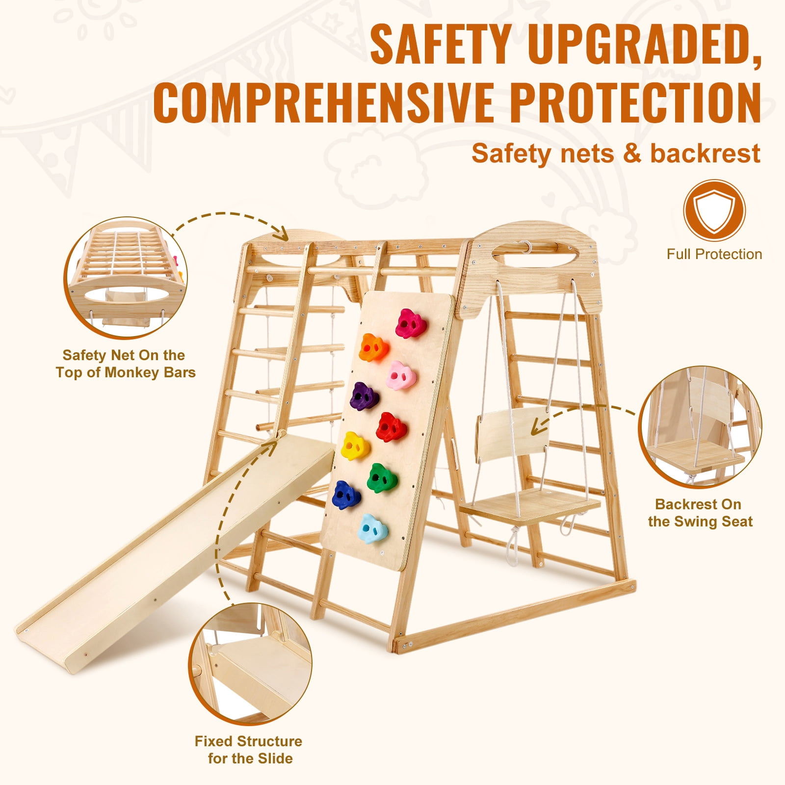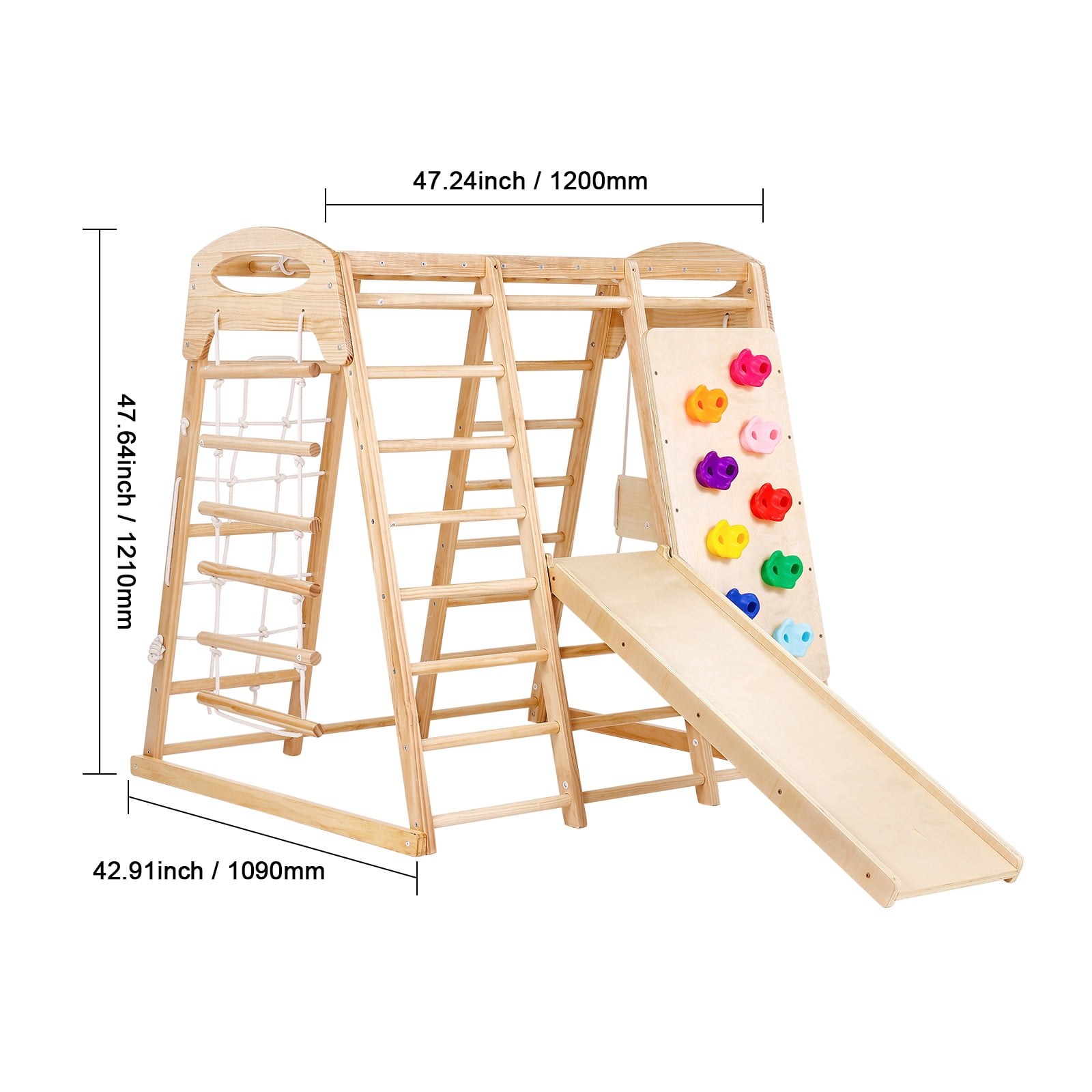 Sturdy Design: Our versatile indoor jungle gym can support up to 300 lbs (136 kg), allowing multiple children to play together safely. Encourages cooperative play and teamwork while developing hand-eye coordination, strength, and social skills. 7-in-1 Play Elements: This indoor playground offers a wooden ladder, rope ladder, net ladder, swing, monkey bars, slide, and climbing wall. Provides a variety of play experiences in one structure, sparking imagination and a sense of adventure. Premium Solid Wood Construction: Crafted from solid wood, our toddler indoor playground features a smooth, burr-free surface with rounded edges for added safety. The odorless paint ensures peace of mind for parents and promotes environmental awareness. Enhanced Safety Features: Our toddler gym has undergone rigorous safety testing and includes design upgrades to address potential hazards. A safety net has been added to the monkey bars to prevent falls, and the swing seat has a backrest for stability. Versatile Usage: Perfect for children’s play areas, preschools, playgrounds, or home use. Easily adaptable to different settings, whether in the backyard or indoors. Provides a safe and fun play space for children to explore and unleash their potential.