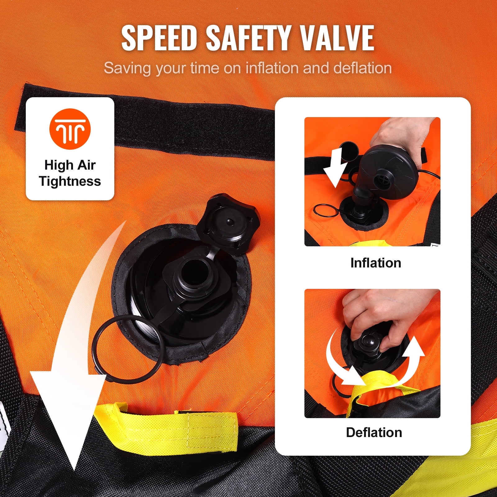 Enjoy a secure and comfortable ride with our SKYSHALO D-shaped couch towable tube for boating. It features high backs and wide side walls to prevent falls into the water at high speeds. With 10 EVA grips and 2 boarding straps, you can have versatile and comfortable hand-holding options and easy re-entry onto the tube after a splash. Experience durability and resistance with our boat tubes and towables. Covered with robust nylon, featuring 840D nylon on the bottom and periphery and 420D nylon on the back, they provide superior UV protection and resistance to aging and punctures. The vibrant design remains fade-resistant, ensuring long-lasting fun in seas, lakes, and rivers. Inflate and deflate our 2-person tube for boating efficiently with the Boston valve. It offers airtight security and simple operation. The quick and hassle-free inflation and deflation process takes less than 10 minutes. When not in use, the tube conveniently folds for storage and transport in a handbag. Enjoy diverse riding experiences with our water sport towable. It offers front and rear towing points, allowing you to attach it to the front for a leisurely float in shallow waters or to the rear for an exhilarating kneeling drift on the EVA mat. Share a thrilling surfing adventure with our spacious inflatable towable tube. It comfortably accommodates up to 2 riders with a maximum load capacity of 340 lbs/154 kg. The ultra-wide seat design ensures stability and balance, making it an ideal choice for adults, kids, couples, friends, or family.