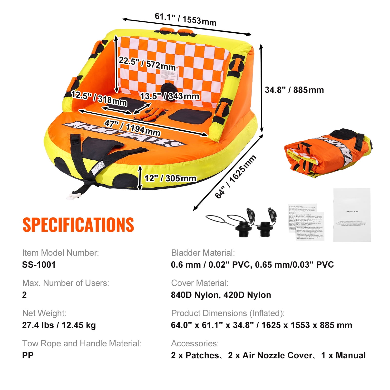 Product Description 2-Person Couch Towable Tube Introducing our incredible towable tube, specially designed to withstand punctures and provide a safe and comfortable ride. With its eye-catching colors, ergonomic high back, wide side walls, and 10 EVA grips, you’ll feel secure and exhilarated as you glide across the water. Switching between towing modes is a breeze, allowing you to customize your adventure. Thanks to the Boston valve, inflation and deflation are quick and effortless. Measuring 64.0″ x 61.1″ x 34.8″ after inflation, this boating towable tube is perfect for up to two riders. We also include two repair patches for added convenience. Get ready to create unforgettable memories with your loved ones as you embark on thrilling water escapades! Exciting and Secure Water Adventure Experience the thrill of high-speed fun with the SKYSHALO towable tube for boating. Feel secure as you lean back on the comfortable 22.5″ high backrest and hold onto the handle for an exhilarating wave-riding experience without any fear of being thrown off. Unleash Your Inner Adventurer Embark on an unforgettable sea surfing adventure with our inflatable towable tube! Crafted with durable 840D and 420D nylon cloth, and featuring inner tubes made of 0.02″/0.6 mm and 0.03″/0.65 mm thick PVC, our boat tubes and towables are built to withstand rough waters and provide long-lasting enjoyment. Effortless 4-Step Inflation Inflating our 2-person inflatable boat tube is a breeze with its fast and secure air valve. Simply unscrew the top cover counterclockwise to inflate, and deflate quickly by turning the entire valve counterclockwise. It’s as easy as 1-2-3-4! Endless Riding Possibilities Discover a world of riding possibilities with the SKYSHALO towable tube for boating. With front and rear traction points, you can enjoy different riding positions and experiences. Adjust the nylon belt for the perfect setup and unlock new thrills on the water. Designed for Unforgettable Moments Create unforgettable memories with your companion on our 2-person boat tube. Its wide and secure deck seats ensure stability and balance for both children and adults, making it perfect for couples, friends, and families. Long-Term Enjoyment Guaranteed We prioritize your long-term enjoyment. That’s why our water sport towables come with 2 nylon repair patches. Easily patch up any defects to continue having fun – simply deflate, clean, apply the patch, and get back to riding the waves. Specifications Item Model Number: SS-1001 Bladder Material: 0.6 mm/0.02″ PVC, 0.65 mm/0.03″ PVC Cover Material: 840D Nylon, 420D Nylon Capacity: 340 lbs/154 kg Tow Rope and Handle Material: PP Max. Number of Users: 2 Net Weight: 27.4 lbs/12.45 kg Product Dimensions (Inflated) : 64.0″ x 61.1″ x 34.8″ / 1625 x 1553 x 885 mm Package Content 1 x Towable Tube 2 x Patches 2 x Air Nozzle Covers 1 x Manual