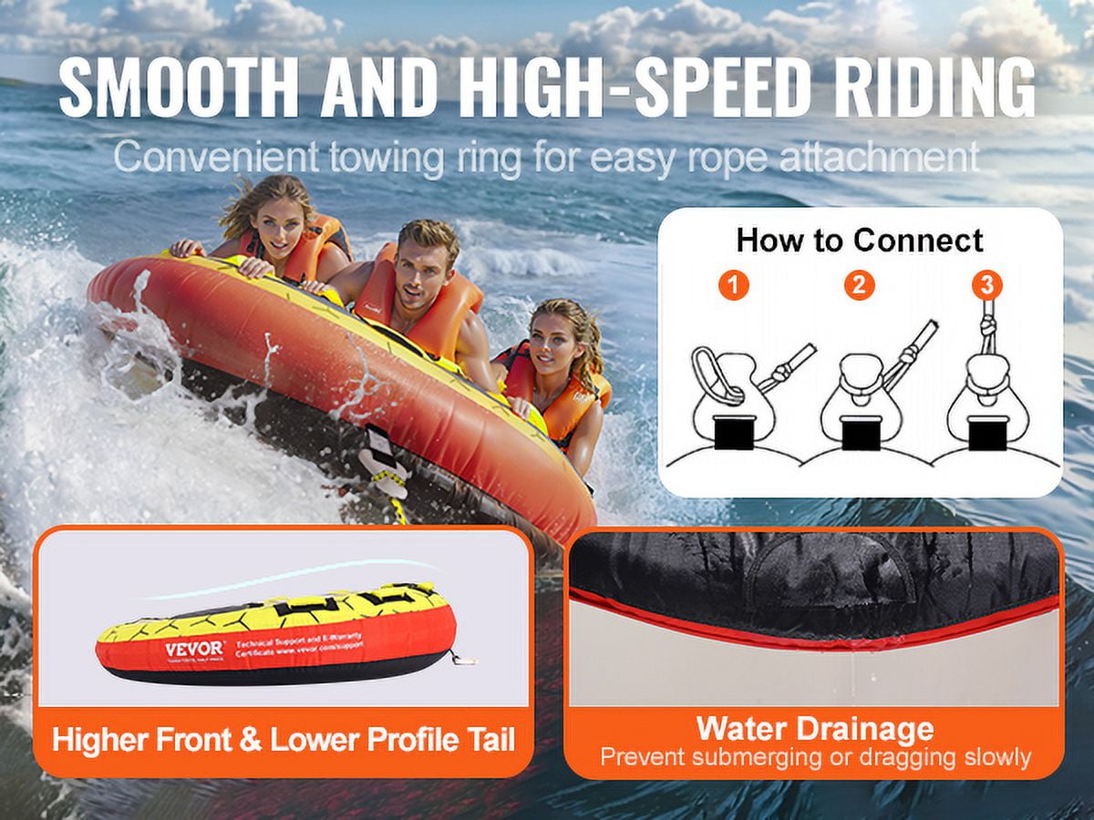 Product Description 3-Person Towable Tube Enjoy a memorable day on the water with our inflatable towable tube. Theyre built to resist punctures and air leaks, with vibrant colors for style. This towable tube is designed for safety and comfort, featuring 6 EVA grips, soft padding, and quick-inflate Boston valves. The streamlined design reduces resistance, and a self-drainage valve prevents water accumulation. Sized for 1 or 3 riders at ?63.0″ x 14.4″ / ?1600 x 365 mm, they come with repair patches for durability. Your Sea Adventure Embark on an exciting sea surfing adventure with our inflatable towable tube! Covered with durable 840D and 420D nylon cloth, and the inner tubes are made of 0.03″/0.65 mm thick PVC. Our boat tubes and towables are designed to withstand rough waters and provide lasting enjoyment. Designed for 1-3 Riders Share thrilling memories with your companion on our 3 person boat tube. Its wide and secure deck seats ensure stability and balance for both children and adults, making it ideal for couples, friends, and families. 4 Steps Inflation Our inflatable boat tube 3 person features a fast and secure air valve. Inflate by unscrewing the top cover counterclockwise, and deflate quickly by turning the entire valve counterclockwise. Its as simple as 1-2-3-4! Escort Your Riding Keep yourself safe during the ride by holding onto the padded handles. These handles ensure you stay firmly in place, even when faced with waves, without causing any harm to your hands. Multiple handles provide versatility. And the padded surface protects your knees and joints. Easy and Reliable Traction Use the front towable tubes traction ring for a simple and reliable setup. Thread the loop through the hole, place it at the rings bottom, and tighten the rope for a secure attachment. 2 Repair Patches We care about your long-term enjoyment. Our water sport towables include 2 pieces of nylon repair patches. Its easy to patch up any defects for continued fun – deflate, clean, apply the patch, and enjoy the waves as before. Specifications Item Model Number: SS-1003 Bladder Material: 0.65 mm/0.03″ PVC Cover Material: 840D Nylon, 420D Nylon Tow Rope and Handle Material: PP Load Capacity: 510 lbs/231 kg Max. Number of Users: 3 Net Weight: 15.2 lbs / 6.9 kg Product Dimensions (Inflated): ?63.0″ x 14.4″ / ?1600 x 365 mm Package Content 1 x Towable Tube 2 x Patches 1 x Air Nozzle Cover 1 x Manual