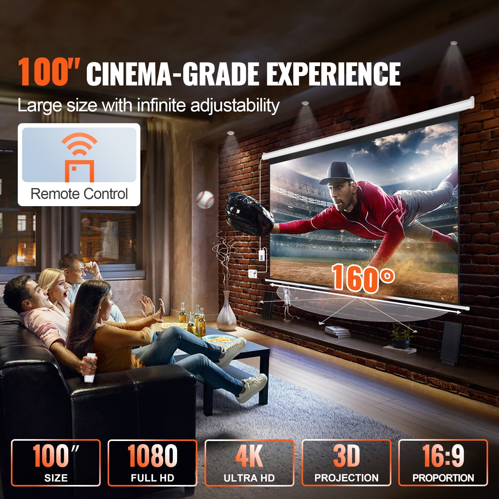 Exquisite Image Quality: Our motorized projector screen is crafted from high-reflectivity PVC material, ensuring every detail shines through and delivering a flawless large-screen viewing experience in any setting. Get ready to immerse yourself in a visual masterpiece. Expansive Viewing Angle: With its wide-angle design, our electric projector screen provides clear visuals for the audience, regardless of their position. This enhances the flexibility of your viewing experience, turning every seat into the best one in the house. Convenient Control: Our motorized projection screen features both wired and wireless remote control options. Easily adjust the screen’s opening and closing, and embrace a life of convenience and intelligence. Hassle-Free Hanging: We understand that installation can be a challenge, so our automatic projector screen arrives fully assembled. Simply hang it on the wall, and it’s ready to use – no installation fuss, just plug and play. Versatile Applications: Say goodbye to limited viewing experiences on small TV screens or monitors. Our drop down projector screen easily transforms into your private theater, ensuring that everyone can share in the joy of movie nights during family gatherings or get-togethers with friends.