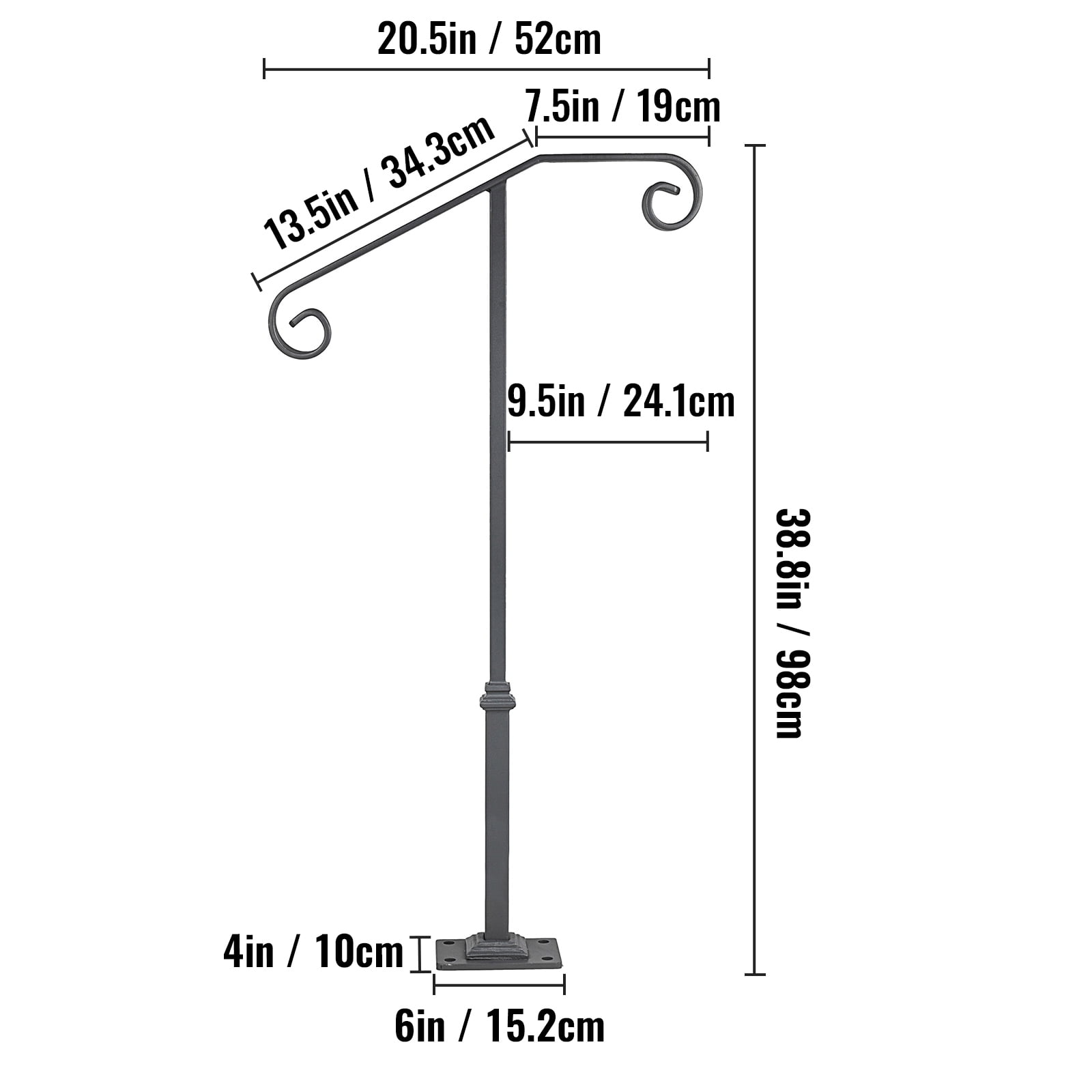 Product Description 1-2 Steps Single Post Handrail Our outdoor staircase railings provide additional protection for the elderly, children, and disabled who find it difficult to use stairs. The railing is made of sturdy wrought iron material and powder coated surface, which is rust proof and easy to clean. It is an ideal choice for various steps such as gardens, residential buildings, porches, hotels, etc. Fit 1 to 2 Steps As a great helper for family members going up and down stairs, this single column handrail is suitable for 1 to 2 steps. It is very suitable for places where it cannot be attached to walls or structures. Real Iron Metal Our single column decorative handrails are made of genuine wrought iron to ensure rust and corrosion resistance. It can maintain a longer lifespan under various weather conditions. Easy to Assemble A single column handrail includes everything necessary to connect the handrail and column to the staircase. It is easy to install and can be assembled in just a few minutes. Powder-coated Surface The powder coating surface of our single forged iron track ensures labor-saving cleaning. You can wipe it clean with water and a cloth. Elegant & Fashion Style Our single column outdoor armrest adopts a classic curly design, which is fashionable and charming. Its elegant appearance provides perfect decoration for your stairs. Versatile Uses Wrought iron handrails are suitable for places with stairs or steps such as homes, gardens, hotels, porches, etc. It plays a supporting role in improving security and convenience. Specifications Size: 20.5 x 38.8 in/52 x 98.6 cm Color: Gray Material: Wrought Iron Installation Method: Screw-In Double Steel Tube Post Thickness: 1″& 1-1/4″ (25 mm & 30 mm) Package Content 1 x Single Post Handrail 1 x Wrench 4 x 3/8 Expansion Bolt 4 x Screws