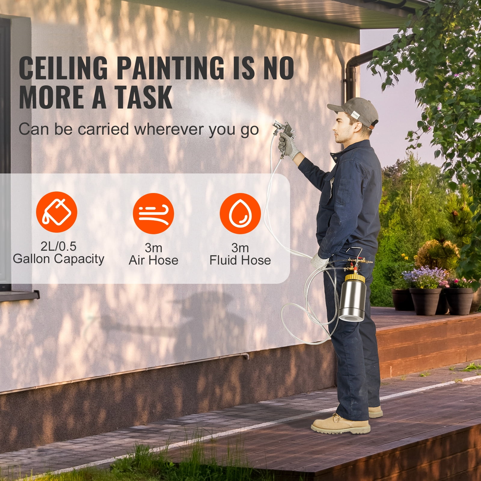 Go-anywhere Paint Tank: Introducing our state-of-the-art 2L/0.5gal spray paint can with 1/4″ inlet and outlet and 3/8″ outlet. Weighing only 4.1 pounds, you won’t feel heavy. It can be carried anywhere and is packaged for easy spraying on ceilings and other high places. 1.8mm Spray Gun: This paint can comes with a 1.8mm nozzle, making it a great choice for anyone who wants to avoid the hassle of buying an spray gun. Suitable for common paints, such as latex paint, metallic paint and other widely used paints. Three knobs can adjust the air volume, color flow rate, and spray width to achieve uniform fan-shaped spray atomization. Adjustable Pressure: The paint tank pressure is adjustable, the maximum pressure is 45psi. You can adjust its accuracy via the height button, and the accuracy indicator shows real-time. The safety of our spray paint pressure tanks is that they can only work safely when the pressure is released when it exceeds 0.3Mpa. Upgraded Sealing: The high-pressure paint tank is modified with high-quality high-strength steel, and a rubber sealing ring is installed at the mouth of the tank. It has four sealing clips for a secure closure and comes with anti-rust and anti-thread sealant. It has become a strict water test before leaving the factory to avoid gas problems. Paint What You Want: Don’t want to pay a high price for a beautician? This epoxy pressure cooker is perfect for home renovation painting jobs. Even novices can get started quickly. Great for furniture, walls, fences, patios and more.