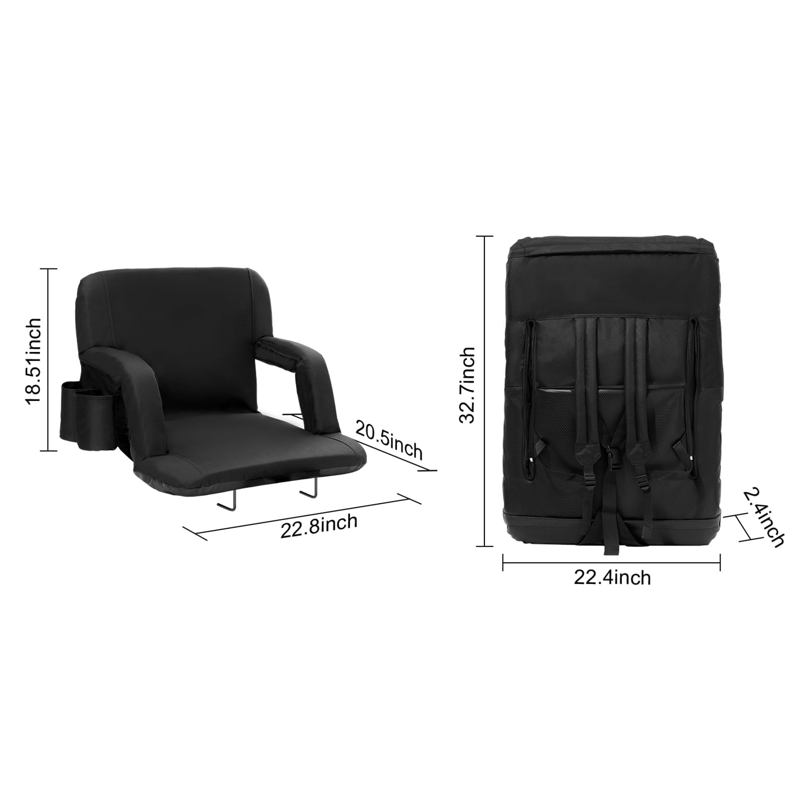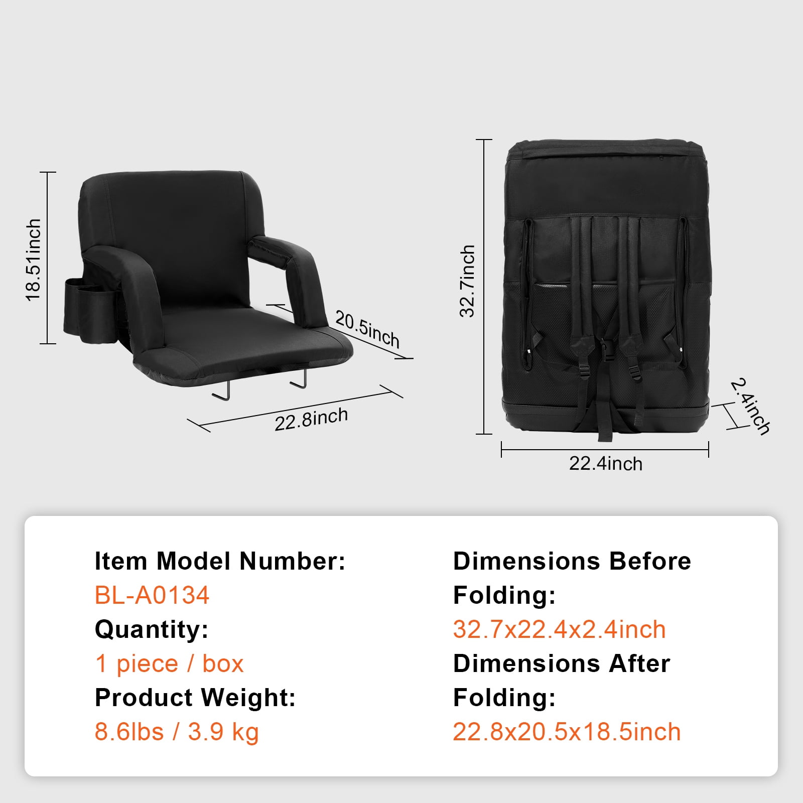 High-Quality Material: This stand chair back features a lightweight rigid frame, thickened high-density sponge and a 600D waterproof Oxford cover for durability. It provides comfort for long periods of sitting. The weather-resistant finish makes it easy to clean and maintain, keeping it dry in light rain or snow. The seats can be extended up to 22 inches to accommodate multiple people. Multiple Storage Features: This outdoor stadium seat comes with multiple side pockets, each with a different purpose, such as a phone pocket and a rear pocket. It includes water bottles, snacks, wipes, etc. It is very convenient to store, making the viewing experience more comfortable. Portable Seat: Portable stadium seats with easy-to-move folding design, can be folded flat in one step, easily loaded into a backpack, easy to carry. It is a great choice for watching professional sporting events, as well as for parties, concerts, picnics and more. It takes up very little space and can be easily stored in the trunk of a car. 6-Position Adjustable Backrest: Folding stadium seats offer 6 adjustable tilt angles such as 90??, 105??, 130??, 145??, 160?? and 180??. Adjust the seat by pushing it from the most forward position and then pushing it back to a flat position. Even during activities lasting several hours, this adjustment provides adequate support while maintaining a comfortable posture. Safe and Stable: There are two iron racks at the bottom that can quickly and easily secure the chair to most posts and benches. Don’t worry about your seat falling into the stands so you can watch the game. Specifications Item Model Number: BL-A0134 Quantity: 1 Piece Per Box Product Weight: 8.6 lbs / 3.9 kg Dimensions Before Folding: 32.7×22.4×2.4 inch Dimensions After Folding: 22.8×20.5×18.5 inch Seat Width: 19.3 inch Seat Depth: 15.4 inch Package Content 1 x Stadium Seat 1 x Set of Accessories