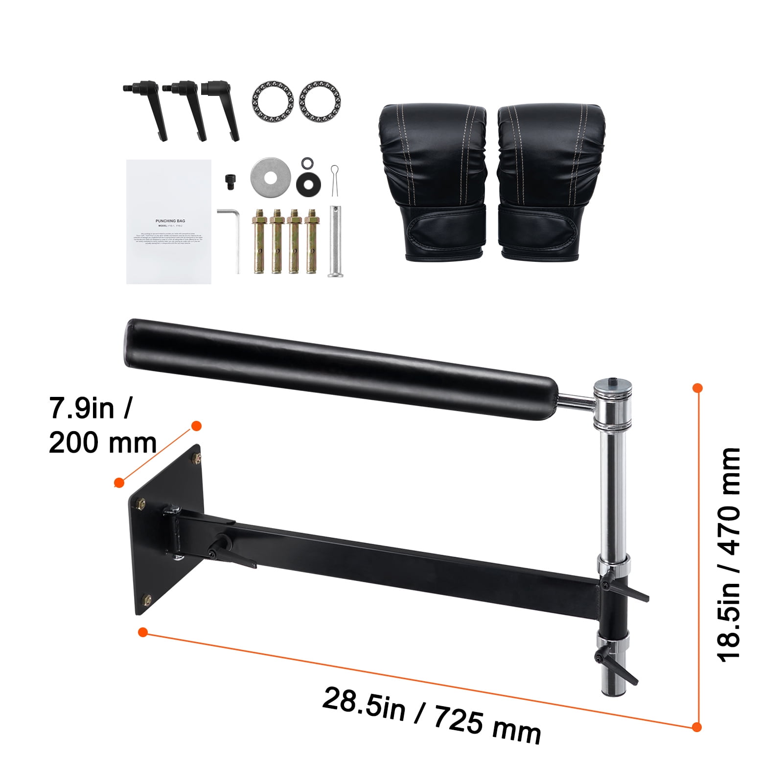 Product Description Punching Bag Designed for wall-mounted installation, securely attach the base to the wall or other fixed objects using three screws. The boxing spinning bar boasts a strong load-bearing capacity, minimizing the risk of falling and ensuring stability during use. Wall-mounted Design Designed for wall-mounted installation, securely attach the base to the wall or other fixed objects using three screws. The boxing spinning bar boasts a strong load-bearing capacity, minimizing the risk of falling and ensuring stability during use. Adjustable Height The support pole of the wall mount boxing speed trainer is height-adjustable, allowing you to adjust the height according to your needs. High-quality Materials This boxing reflex bar is made of PVC leather sandbag + over-gluing + encrypted fabric, with the inner bladder upgraded from rubber to latex, allowing users to train for extended periods without worrying about damage. 360° Flexible Swinging Arm The rotating pole with 360° rotation can enhance hand-eye coordination and sharpen punching speed. The boxing speed bar supports both upward and downward installation. Versatile Application Scenarios The boxing training equipment helps users improve reaction, speed, accuracy, and striking ability, suitable for both beginners and experienced individuals looking to hone their skills. Space-saving When not in use, you can loosen the screws and fold the equipment against the wall to save space. Specifications Item Model Number: BGB-1 Color: Black Material: Carbon Steel Net Weight: 11.7 lbs / 5.3 kg Product Size: 28.5×7.9×18.5 inch / 725x200x470 mm Package Content 1 x Boxing Bag Set 1 x Set of Accessories