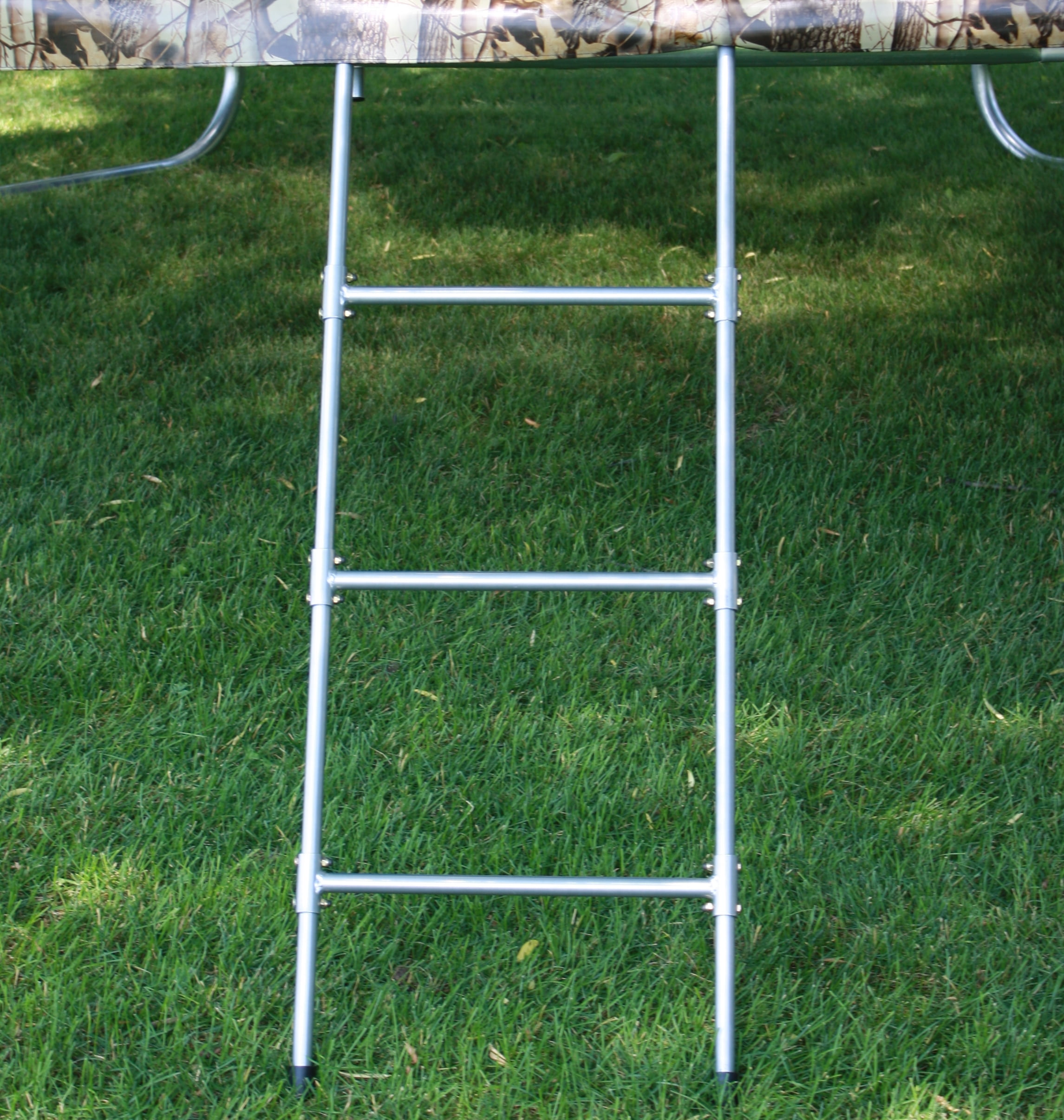 MATERIALS: Made of weather-resistant galvanized steel FITS: Fits trampoline rails up to 4″ in diameter FEATURES: Comes with three foot steps and easily hooks onto your trampoline.