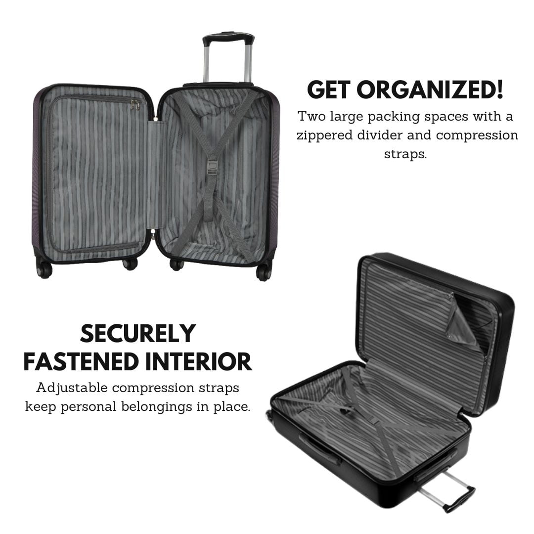 【🌟 Effortless Maneuverability】The 360° spinner wheel system makes this suitcase with wheels perfect for navigating airports, crowded terminals, and uneven terrain, ensuring maximum stability during your travels. 【🏆 Ergonomic Handle System】The telescoping handle, part of the Roche Harbor luggage set, provides a comfortable grip, so you can effortlessly pull your spinner luggage without strain, whether you’re embarking on a short trip or a long-haul adventure. 【🎒 Spacious Interior】This large suitcase offers ample storage capacity with mesh pockets and adjustable compression straps to keep your travel luggage organized and secure. Say goodbye to disorganized baggage and hello to stress-free packing and unpacking. 【✈️ Versatile Luggage Sets】Roche Harbor’s hardside luggage sets include options like the 3 piece luggage set and carry-on suitcase. These suitcase sets cater to every traveler’s needs, making them ideal for both short getaways and extended journeys. 【💼 Durable Hardside Protection】Crafted from hardshell material, Roche Harbor spinner luggage not only ensures the safety of your baggage but also adds a touch of style to your travel gear. Upgrade to the Roche Harbor hardside luggage collection for unbeatable value on your luggage set purchase.