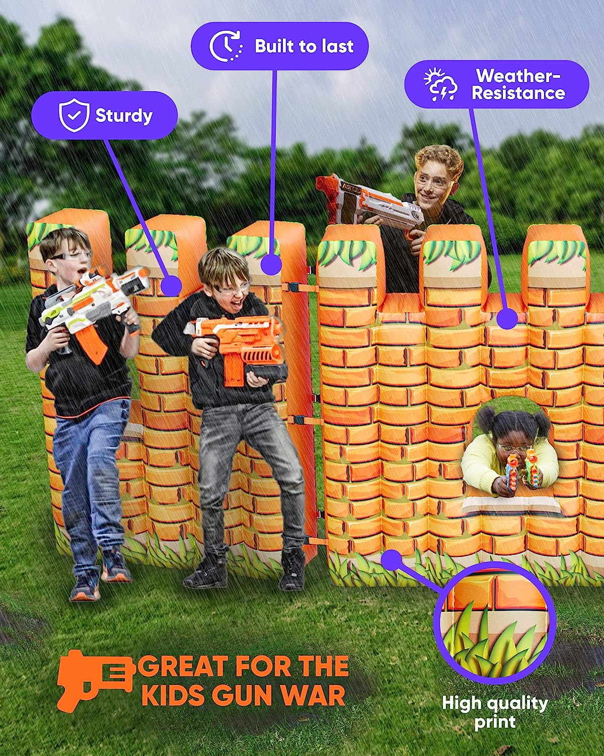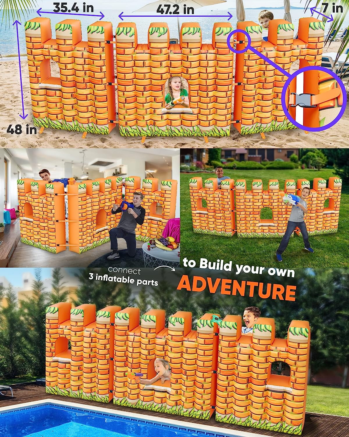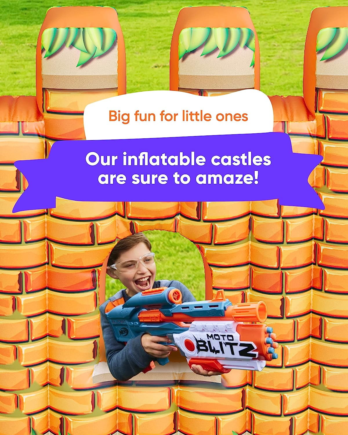 Play Together The Inflatable Castle provides endless opportunities to foster social and recreational skills by encouraging outdoor play with friends and family. With a range of beach toys, a ball pit, and a vortex, the Inflatable Castle is the gateway to a world of limitless play and boundless imagination. Great for family get-togethers, birthday parties, and outdoor events, the Inflatable Castle provides hours of fun and learning experiences, allowing children to develop important social skills while creating memories that will last a lifetime. Create Imaginary Worlds Create a safe and private environment for your child’s imaginative play with this easy-to-assemble castle-shaped. At 4 feet x 12 feet, it’s a good size for a playdate in your backyard, a picnic in the park, or just a cozy afternoon at home. Let your child’s imagination run wild with toy shooters, and bullets, knowing they’re safe in their own personal play space. With this as a base, your child can explore the realms of their own making and be free to express themselves creatively in a secure environment. Built to Last This durable construction and repair patch allows your children to enjoy the same fun and imaginative playtime over and over again. The three castle-shaped panels that come with your purchase provide an ample foundation for water balloon fights, snowball fights, squirt battles, and the capture of the flag. Your children’s imagination can run wild with the possibilities of any targets, or even a water fight. The durable construction allows your family to extend the use and enjoyment of your inflatable for years to come.