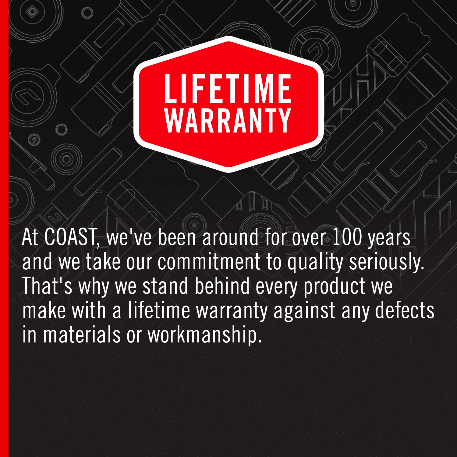 Wield bright light wherever you go. The rechargeable and waterproof SLAYER flashlight carries like it was meant to—and it was. The all-aluminum frame’s flat rectangular shape slides easily in and out of pockets and secures in place with a removable metal clip when tucked away. Featuring a dual optic system, the flood and spot beams cycle through five modes—medium flood, high flood, spot, low flood and Turbo—with a simple button click. Set your favorite or go-to light mode using the COAST Memory Mode function—hold the rear switch down until the light flashes. Once set, Memory Mode allows you to jump straight to your beam selection when you press the rear switch. On lower power, this go-everywhere light can run up to 11 hours. And on Turbo, the SLAYER peaks at 1150 lumens with a beam length of 130 meters (426 feet). During use, the charge level indicator ensures you always know when to plug in—the integrated ZITHION™ rechargeable battery powers back up fast via the USB-C port in just two hours. Constructed of top-grade materials and fit for the toughest work, the SLAYER is rated IP67 dust resistant, waterproof, and backed by the COAST lifetime warranty.