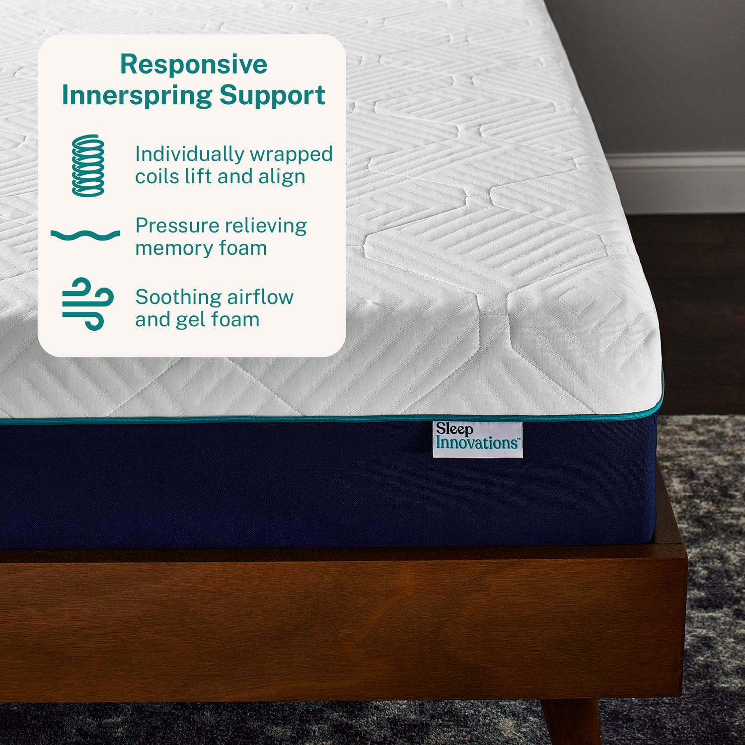 The Sleep Innovations Hudson Hybrid Mattress provides rigorous support for today s body. Cooling gel memory foam and a resilient innerspring system create the perfect balance of support and comfort. Individually wrapped coils keep you lifted and aligned. The coils also allow air to flow freely, moving heat away as you sleep. A foam perimeter adds extra edge support and helps the mattress keep its shape. Gel memory foam relieves heat, keeping you cool throughout the night. Its gentle pressure relief allows for more restorative sleep. Plus, our foam is CertiPUR-US certified for content and durability. Feel lighter, sleep deeper, and wake up refreshed.