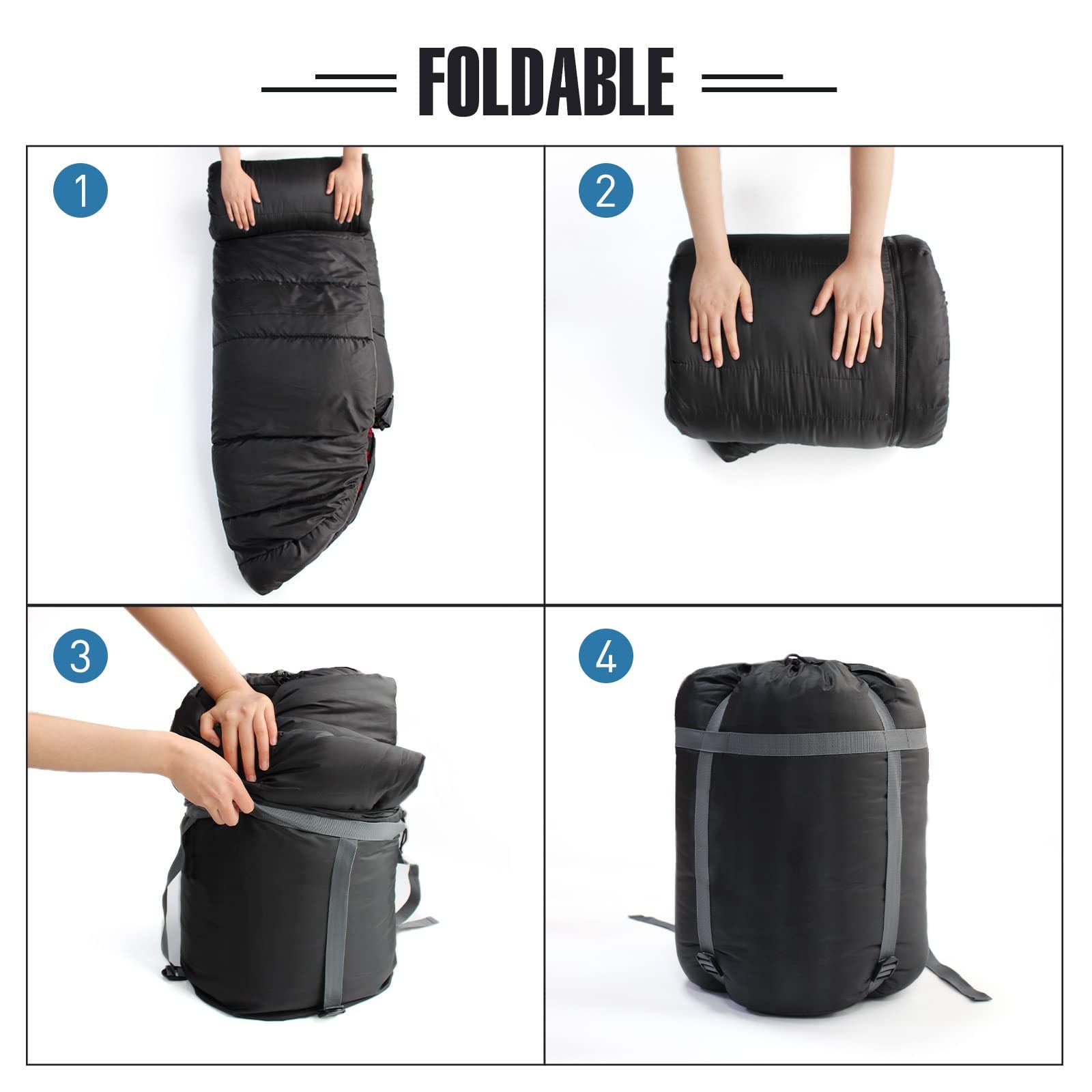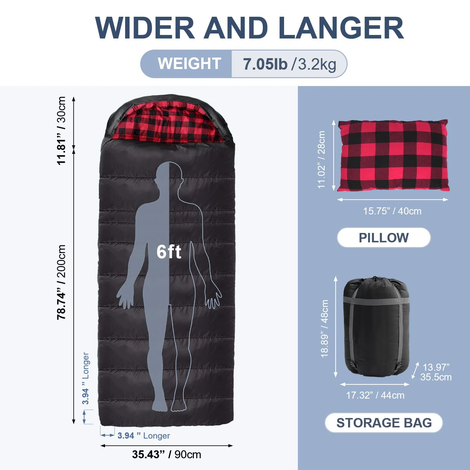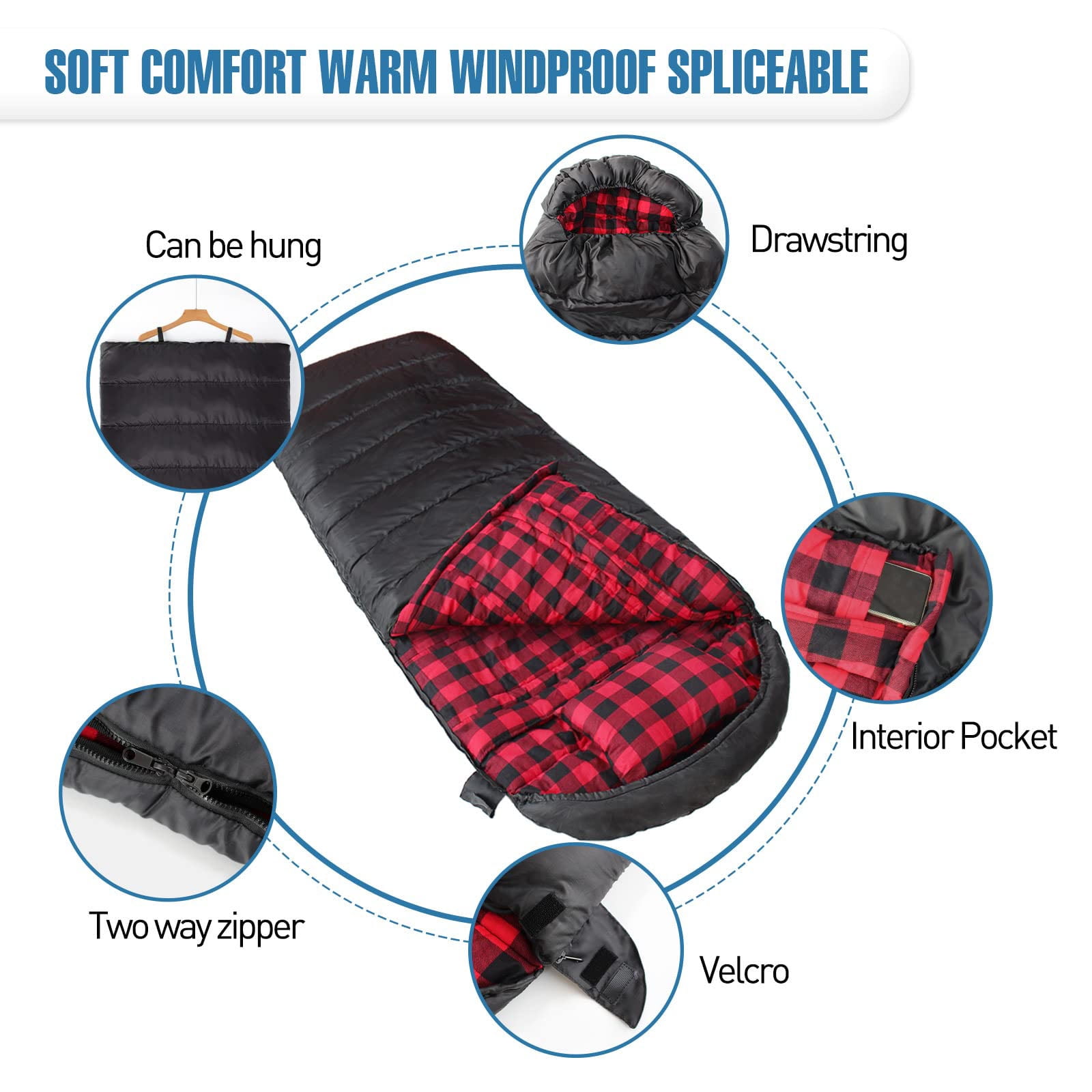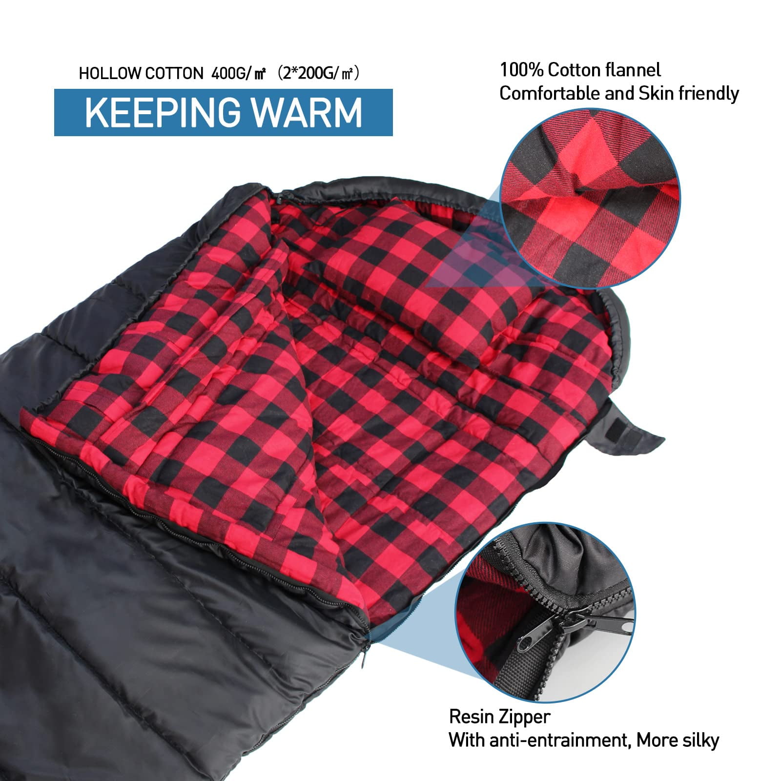 Features: Big and Tall Sleeping Bag: XXL Adult Sleeping bag, wider than regular camping sleeping bag. Give yourself room to turn around so you feel comfortable in any position. Two-layer structure: Our sleeping bag upper and lower pieces each 400g/㎡(2*200g/㎡) hollow cotton filling, warm effect is better. Lined with cotton flannel soft and comfortable. And it comes with a pillow to give you a wonderful sleep experience. Unique zipper design: Resin inside and outside double open zipper with upper and lower anti-entraining makes the zipper more smooth to use. High quality two-way zipper to make your camping experience more comfortable. Water repellent& Windproof: The shell is anti-tearing & waterproof, ensuring your sound sleep all night long. Sleep at night is not affected by cold winds, and sleep quality is better. Pillow: Provide support for the head and neck, making sleep more comfortable and improving sleep quality. Drawstring on the hood: Tightly wraps around your head, increasing warmth. Velcro on the zipper: Prevents the zipper from accidentally opening when you turn over, keeping you warm. Bottom zipper: Allows good ventilation around your feet. Phone storage pocket: Can hold small items to prevent loss.Specifications: Size:(78.74+11.81)*35.43 inch Compression bag size: 16.53*11.81*11.02 inch Weight: 7.05Ib Color: Black & Red Outer Fabric: 100% Polyester 210T Inner Fabric: 100% Cotton Flannel Filling: 100% Hollow Fiber 400g/㎡ Zipper: Resin Zipper Package Includes: 1*Sleeping Bag+1*Pillow+1*Carry bag Comfort 30℉/-1℃ Limit 16℉/-9℃ Extreme 0℉/-18℃