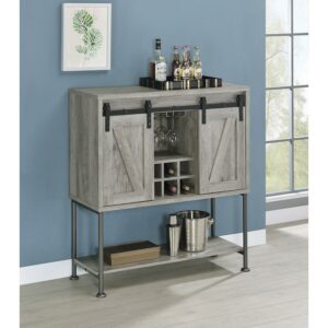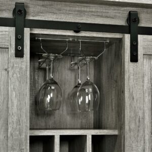 Perfect for a cottage or lakeside getaway, this bar cabinet features a light grey driftwood finish that is charming and cheerful. Place this bar cabinet in a rustic farmhouse home, as it offers country charm with two sliding barn doors that offer ample storage space. Crafted of a high pressure engineered veneer laminate, this bar cabinet is made to last for many years in the home. Plus, it offers one adjustable shelf behind each door. In addition, it has an open space to display favorite decanters and barware, along with a stemware rack mounted above and a six bottle wine storage.