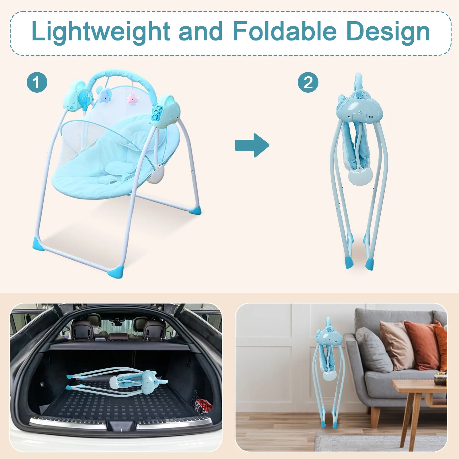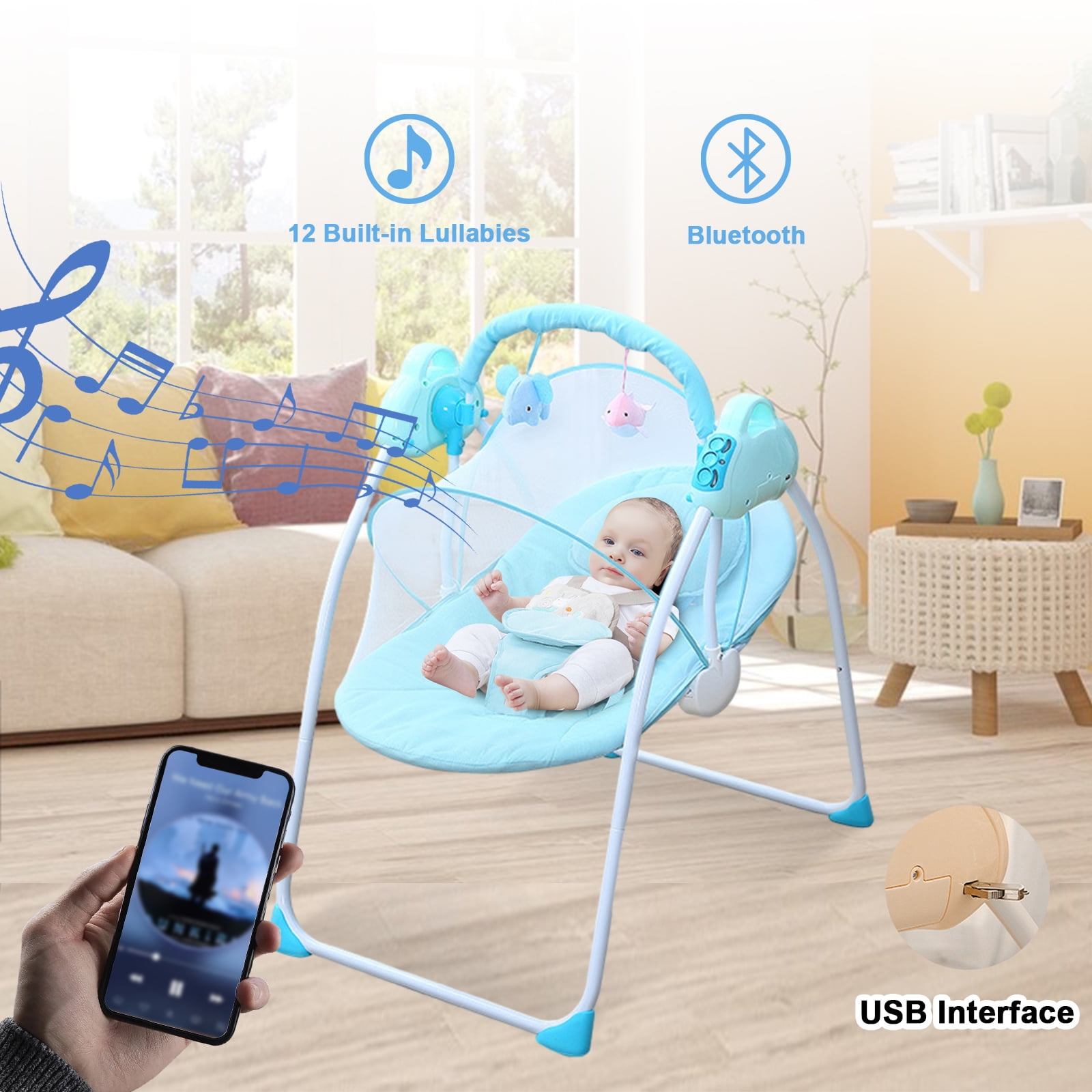 SLLINGLUO Folding Baby Swing, Infant Swing with Music and Toys, Baby Swing with 5-Point Harness, Blue