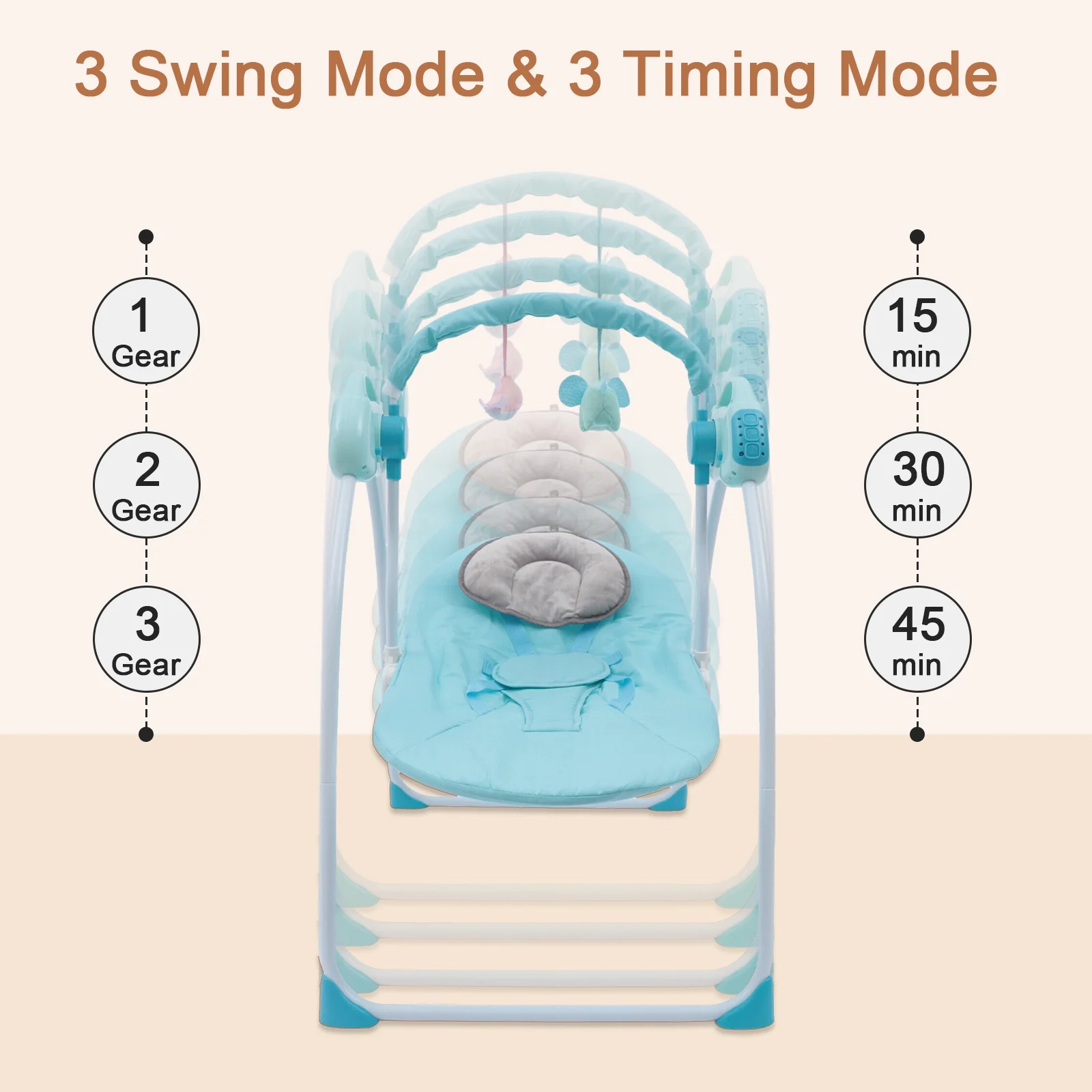 SLLINGLUO This baby swings are designed for babies, this one suits babies under 44lbs. It accompanies babies from their 1st to 18th month generally, relieving parents’ hands greatly during the hardest parenting time.Coming with the complimentary moon and star interactive toys, your baby will love to interact with them while lying on the infant swing. While playing with toys, babies motor skills and muscles get trained for crawling.With our 3-point harness system, your baby can be fixed in the swing chair and just enjoy the swinging happiness while being embraced gently and comfortably.