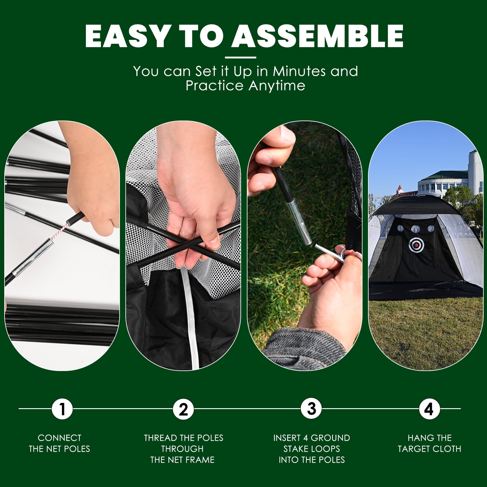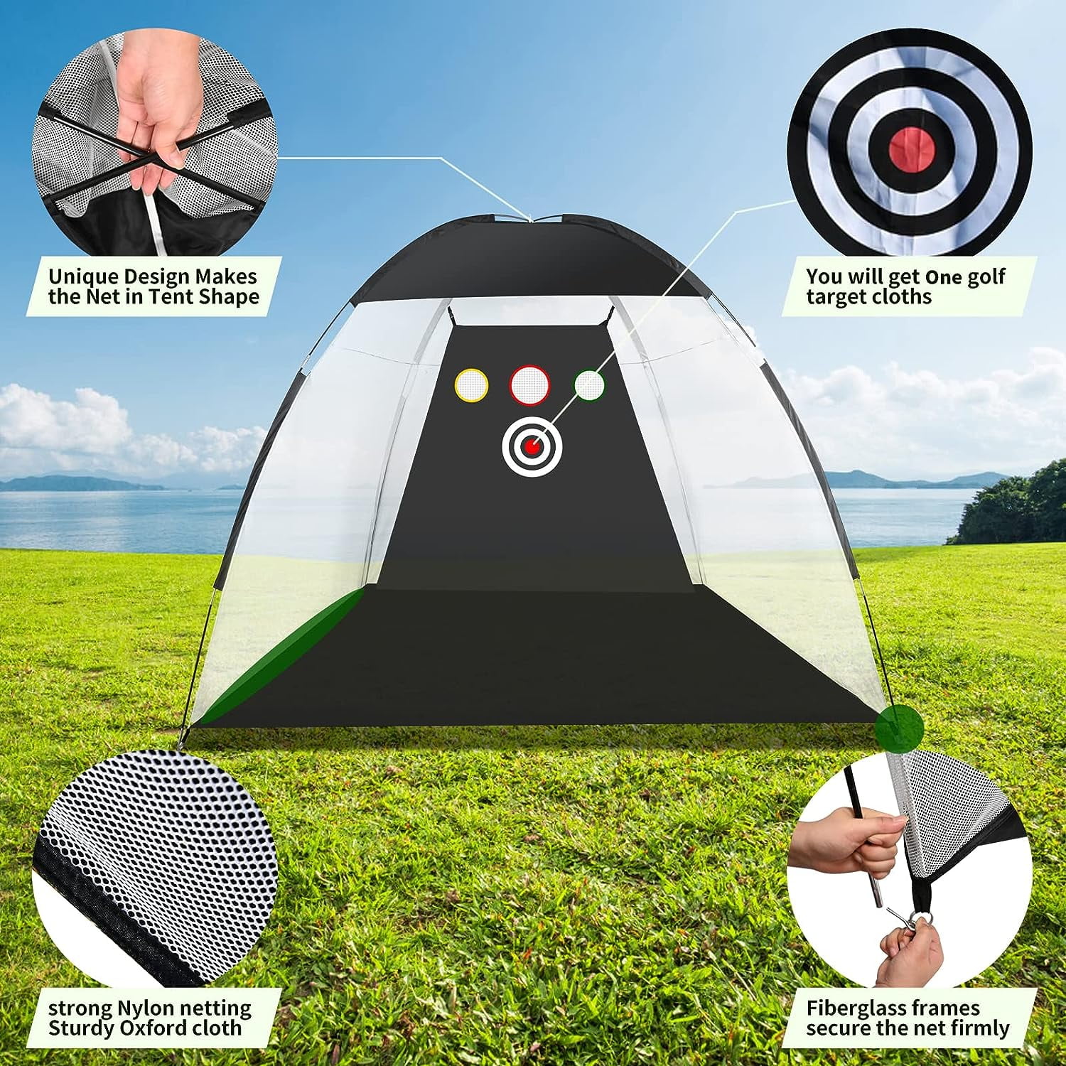 Slsy golf net is equipped with a target, a hitting mat, 3 balls, a tee and a carry bag. And can be can be folded into a compact size for easy storage and carrying. No limitation for golf practice anymore!You can play golf aristocratic sports at home, swing contact, weather is not affected, cost-effective, suitable for all ages, exercise, cultivate temperament.