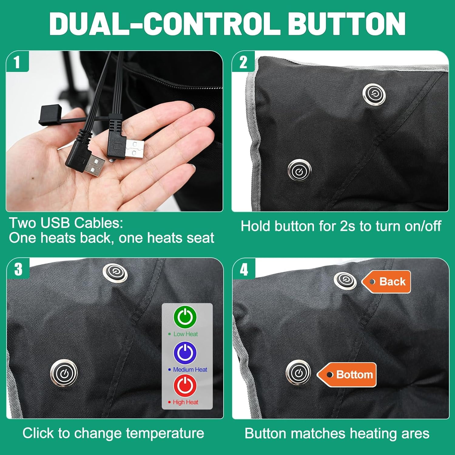 Slsy Heated Camping Chair features USB-powered heating technology ( battery not included). Provides the ultimate warmth and comfort for your body in cold weather, keeping you warm and comfortable at any outdoor sports, beach, lawn, picnic activities. Designed with 3 heat settings (High, Medium, Low). A simple push of the button can warm up your seat. Works with any USB battery pack ( battery not included) and lasts for hours. Slsy heated camping chair folds up compactly and comes with a carrying bag, making it easy to take with you on any adventure. Now you can enjoy this supreme comfy outdoor folding chairs and easily transport to camp, lawn, concerts and festivals. The fully padded seat provide you an ultimate comfortable seating experience. The oversized & moon-rounded design help you to relax and enjoy your journey. The sturdy steel frame construction can withstand up to 500 pounds of weight.