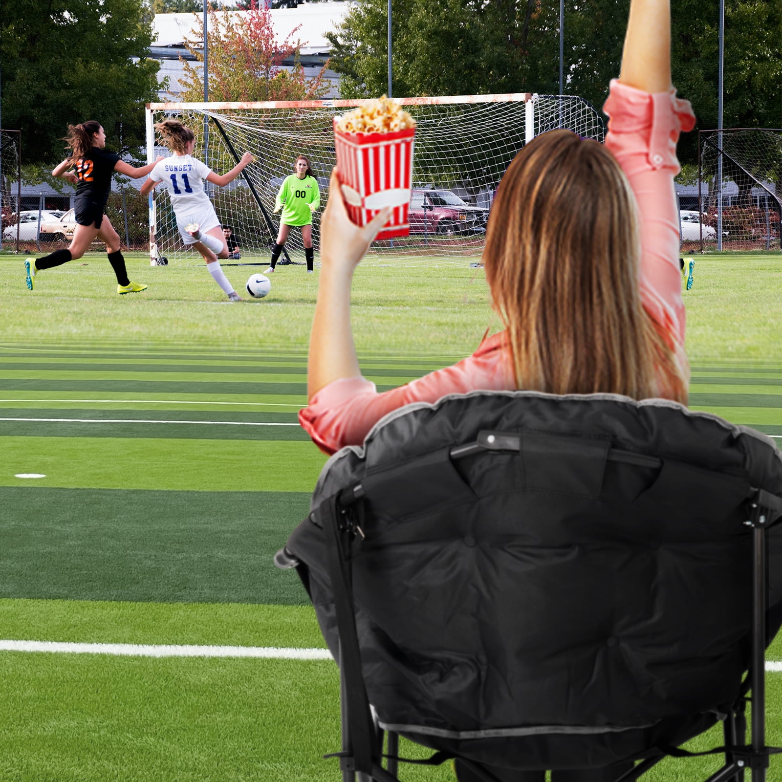 Heated Camping Chair: The Heated Camping Chair features USB-powered heating technology ( battery not included). Provides the ultimate warmth and comfort for your body in cold weather, keeping you warm and comfortable at any outdoor sports, beach, lawn, picnic activities. The spacious seat, backrest, and armrests are made with ultra-soft luxurious padding for maximum comfort. Works with any USB battery pack ( battery not included) and lasts for hours. Simply plug the USB cable into the USB Port of your battery and warming up your portable camp chair. Heat System: The battery heated camping chair quickly warms up both your back and seat . Featured with 3 different Heat Mode [Green Light (Low)/Blue Light (Medium)/Red Light (High)] up to 131℉/55℃ that can keep you warm for hours during the cold season. Extremely Comfy & Space Saving: The fully padded and cushioned armrest, high back, and seat provide you an ultimate comfortable seating experience. The oversized & moon-rounded design help you to relax and enjoy your journey. Easy to use: The foldable padded camp chair comes with a carry bag. you can take it to anywhere. Setting this portable club camping chair up is effortless and fast. You just take it out of the storage bag, pull the frame apart, and it’s ready to go for enjoyment of this super comfortable outdoor folding chair and easily transport to camp, lawn, concerts and festivals. The attached cup holder frees your hands while camping, hiking, traveling or watching sporting events, and easily store your drinks, sunglasses, and phone within hands reach. Durable Frame: Made with premium, high-quality materials, this camping chair is built to last. The sturdy steel frame construction can withstand up to 500 pounds of weight. Padded Seat & Back can provide extra comfort while sitting on it.