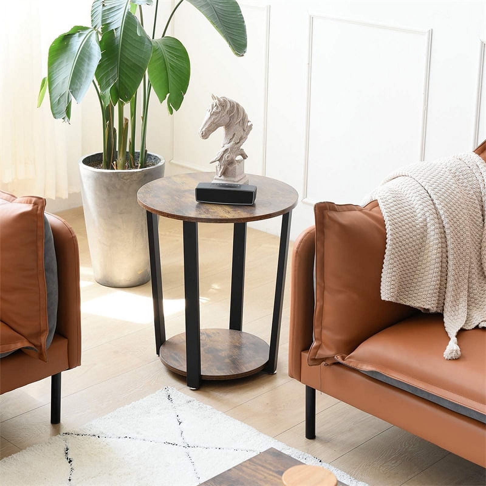 Key Features: Stylish Industrial Design: The Lusimo Small Round 2 Tier Side Table for Living room features a chic combination of a rustic brown MDF top and a sleek black steel frame, enhancing the industrial aesthetic of any room. Versatile Functionality: Perfect for small spaces, this round side table can serve as an end table, nightstand, or even a small coffee table. Its compact size and elegant design make it a versatile addition to any living room or bedroom. Durable and Strong: Crafted with a sturdy steel frame and scratch-resistant MDF board, this round end table supports up to 220 lbs. The high-quality materials ensure long-lasting durability and reliability. Convenient Storage: With two tiers of storage space, you can easily organize and display items like cups, magazines, or decorative accents. The bottom shelf is ideal for bulkier items or additional storage needs. Easy Assembly: The Living room end tables comes with clear instructions, numbered parts, and an assembly kit, making the setup straightforward and quick. The adjustable protective feet help keep the table stable on uneven floors. Specifications: Color: Rustic brown, Black frame Material: MDF board, steel Product Size: 20 x 13 x 22 inches (L x W x H) Desktop Diameter: 20 inches Bottom Diameter: 14 inches Max. Total Load Capacity: 220 lb (100 kg) Package Include: 1 x Side table 1 x Accessories package 1 x User manual Warm Tips: Please follow the instructions to assemble the rustic sofa table. Please don’t exceed the weight capacity.