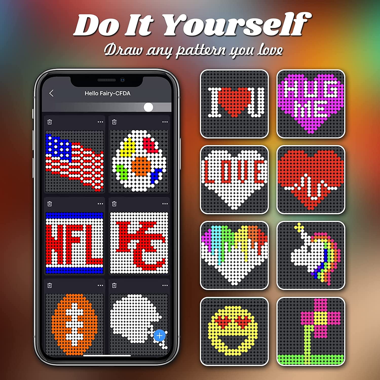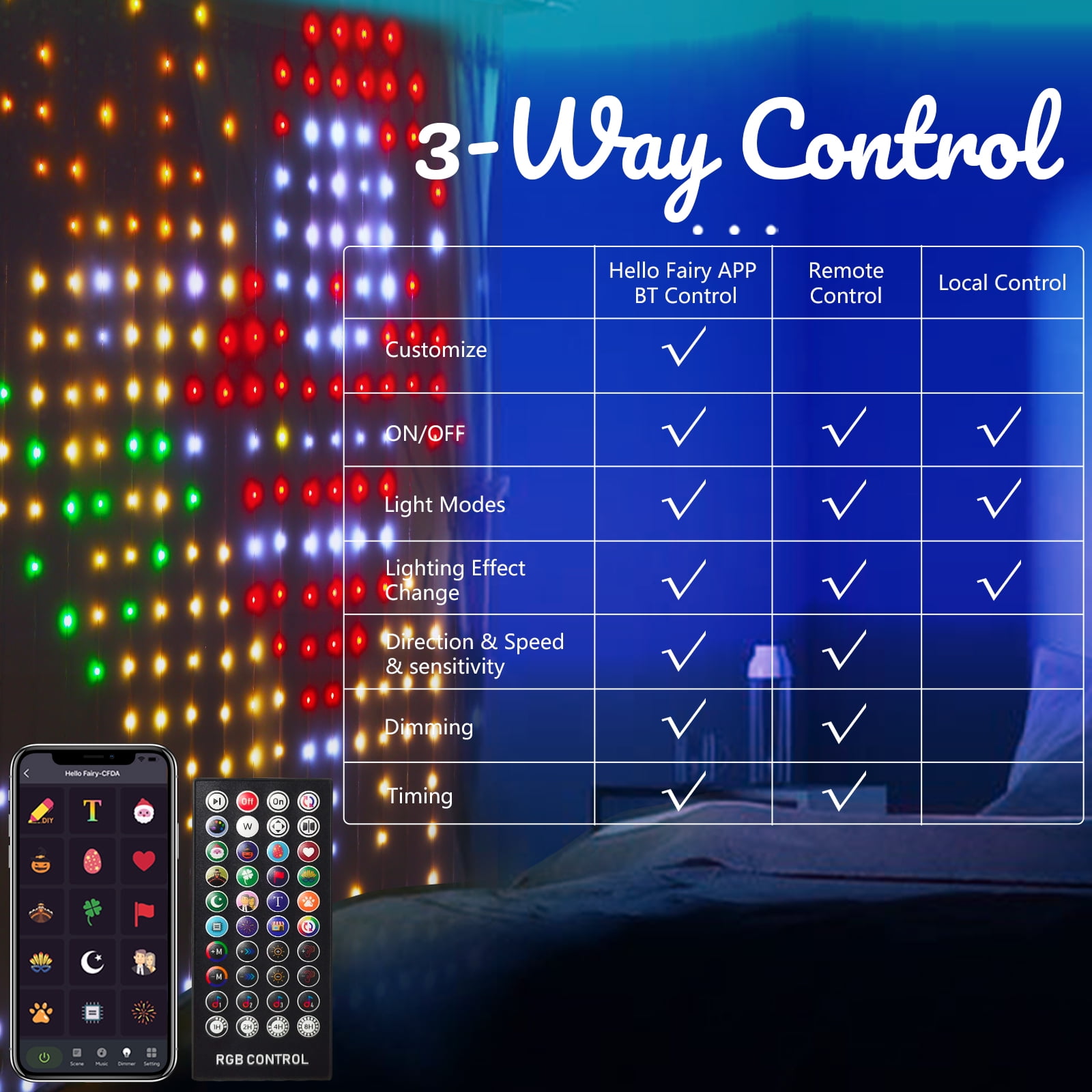 Feature [Over 100 Holidays Pattern Lights]- Celebrate every holiday with style! Our curtain lights feature over 100 pre-set holiday patterns, including Easter, Ramadan, and Baby Shower decorations. Add a festive touch to your home with these multi-functional, versatile lights. Perfect for Christmas decorating! (Please Note These Are Not Actual Curtains) [Unleash Your Creativity]- The curtain lights feature programmable functions, allowing you to create your favorite patterns and animations. You can also enter any text, and the curtain lights will scroll to display your words. Whether it’s a special message, a festive design, or a unique logo, you can easily bring your ideas to life with the Hello Fairy app. With its user-friendly interface, you can easily to create the perfect display for any occasion, making it the perfect choice for Christmas, holidays, parties, or any special events! [5 Music Sync Lights]- Add the perfect touch of fun and excitement to your party gatherings with the 5 different music sync lights. Easily adjust the light to beat with the rhythm of your favorite music, creating a lively and holiday decorations. [Stunning Holiday Backdrop]- The fairy light curtain with 16 million colors and a wide range of color choices – green, pink, white, dynamic, or static lights – perfect for outdoor every festival decorations and creating a stunning holiday backdrop. [Timing & Dimmable]- Bring magic to your home with our versatile christmas curtain lights. Set a timer and have the lights turn on automatically when you arrive and turn off late at night. Adjust the brightness with 1-100% dimming to create the perfect ambiance. Ideal for Christmas holiday home decorations, bedroom decor, and more! (Additional Dimmers Are Not Available) [Extensible]- If you have a blank wall over 13ft, it is perfect to hang multiple smart curtain lights. You can make them expand into a whole to display a huge word or pattern light, and you can also make them display the same light effect synchronously. Up to 4 led curtain lights can be controlled in groups through the Hello Fairy Bluetooth APP, great for home decor. [Effortless Installation]- The window curtain lights are equipped with 20 hooks, a remote control with battery included and a low-voltage safety waterproof plug, making it easy to hang them. The curtain lights can be controlled through the Hello Fairy Bluetooth app, which can be easily downloaded to start lighting up your home with ease. (When Using The Remote Control, Please Aim At The Signal Receive) [Quality You Can Trust]- Our rainbow curtain LED lights are CE / UKCA / ROHS / FCC / UL588 certified, ensuring their safety and reliability. With a 2-Year warranty and 24/7 support, you can feel confident in your purchase. And in the unlikely event of any issues, we offer free replacements. Specification: Material: Plastic+Silver Copper Wire Size: 6.6×6.6FT LED Quantity: 400Leds Color: RGBW Waterproof rating: IP44 Powered by: USB DC5V Power supply: Adapter Input voltage: 100-240V Control method: Remote/APP Control/Control box Working temperature: -20℃—50℃ 8 Modes Switch: on the USB or Remote controller Package Content: 1 x LED Curtain Light 10 x Hooks on the Light Strip 1x Remote Controller 1x Instruction Manual