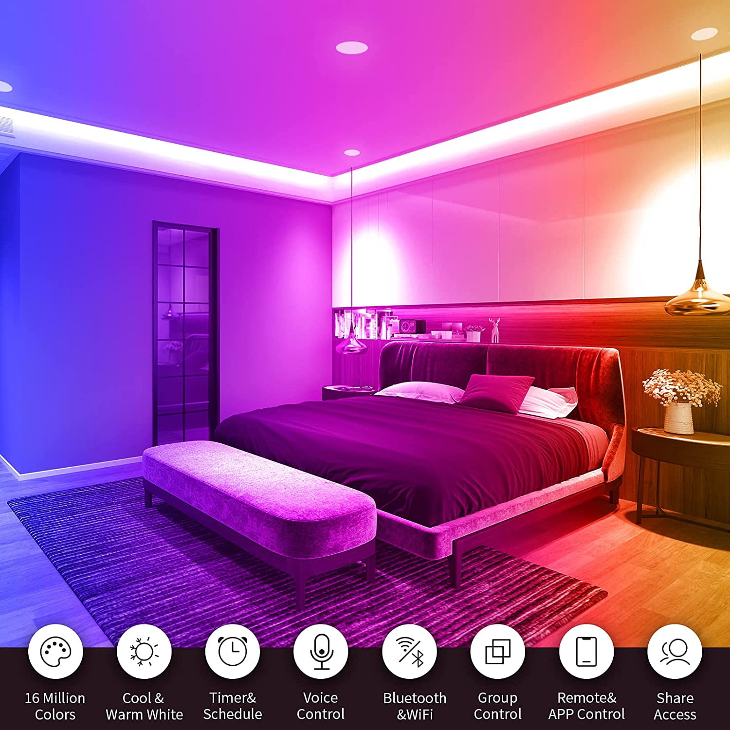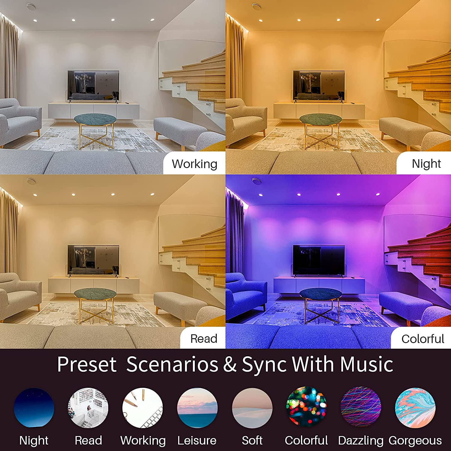 ã APP Controllable ãNo fumbling in the dark, just take out your phone and light them on. Only Support 2.4GHz WiFi â Download the Smart Life APP â¡Connect hub via Auto Scan. â¢The hub will automatically search for recessed lighting and connect. â£Completely control of your smart recessed lighting via Smart Life APP. There’re many functions will bring more conveniences to your lifestyle. ã RGB and CW Dimmable ãSelectable 16 millions colors and Cool & Warm White provides you the options to change your lights color to fit your changeable scene. 800LM; CRI>80; 10W LED recessed lights equal to 80W Incandescent lamp. ã Voice Controllable and Music Synchronous ãCompatible with Alexa/Google Home Assistant/Siri. Create your own dialogue to release your hands and time and control the recessed lights to become specific status by giving the pre-set command. These lights will change its color with the music beats, hands claps, gaming sounds, and synchronize every sounds your phone received. Notice: It’s based on your phone’s microphone, not individual built-in mic or speaker. ã Brightness and Saturation ControllableãThese 4 inch recessed lighting is able to control its brightness and saturation to set up your personal colors. You can change its brightness while you use the lights at night or during the day. Combine selectable RGB lights with saturation will change into some uncommon color. ã Pre-set and Editable Scenarios ãPre-set scenarios helps you get into the statement quicker, providing 8 scenes lighting to meets your demand. These smart lighting even more provides the editable options to help your create your own scenarios.