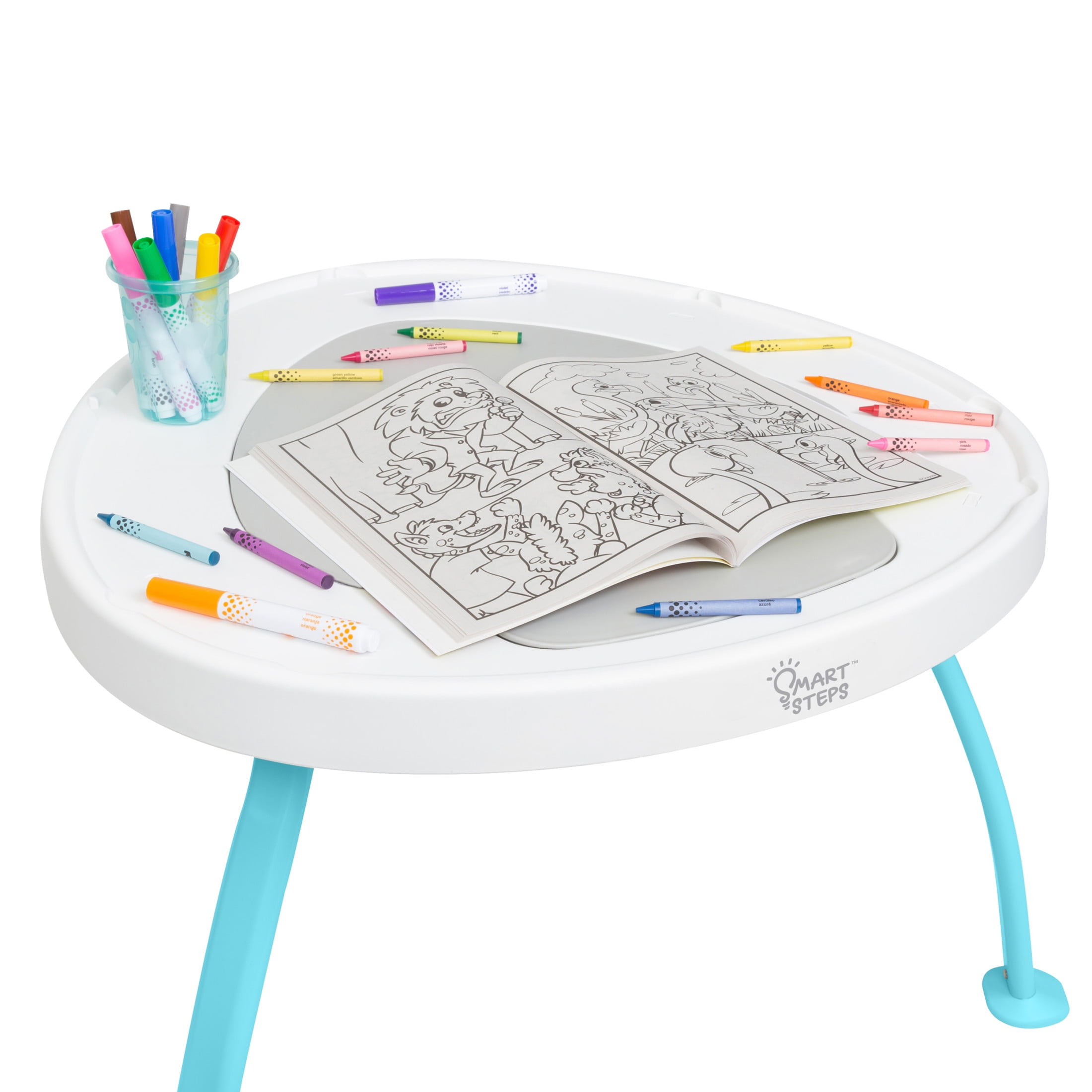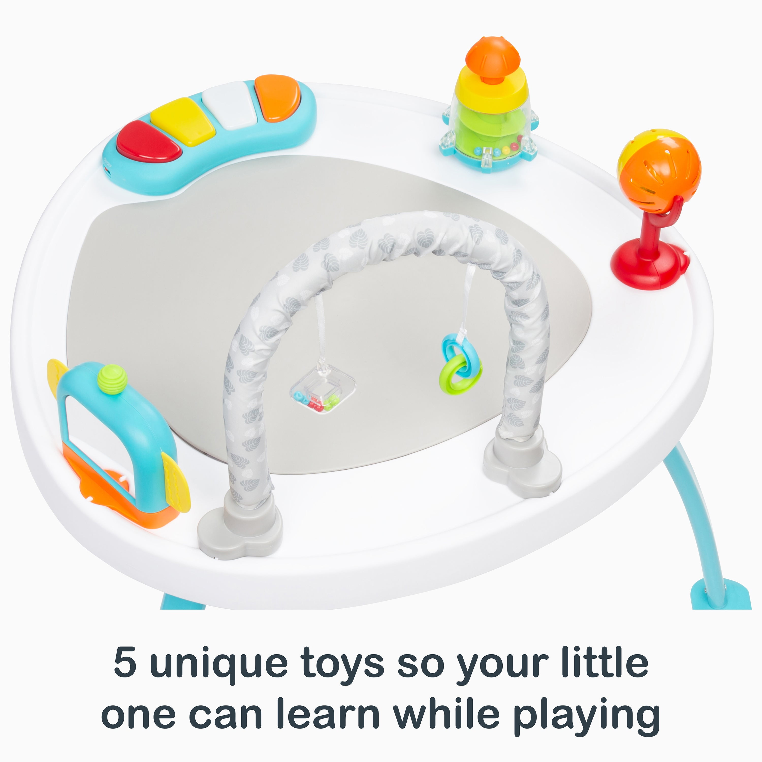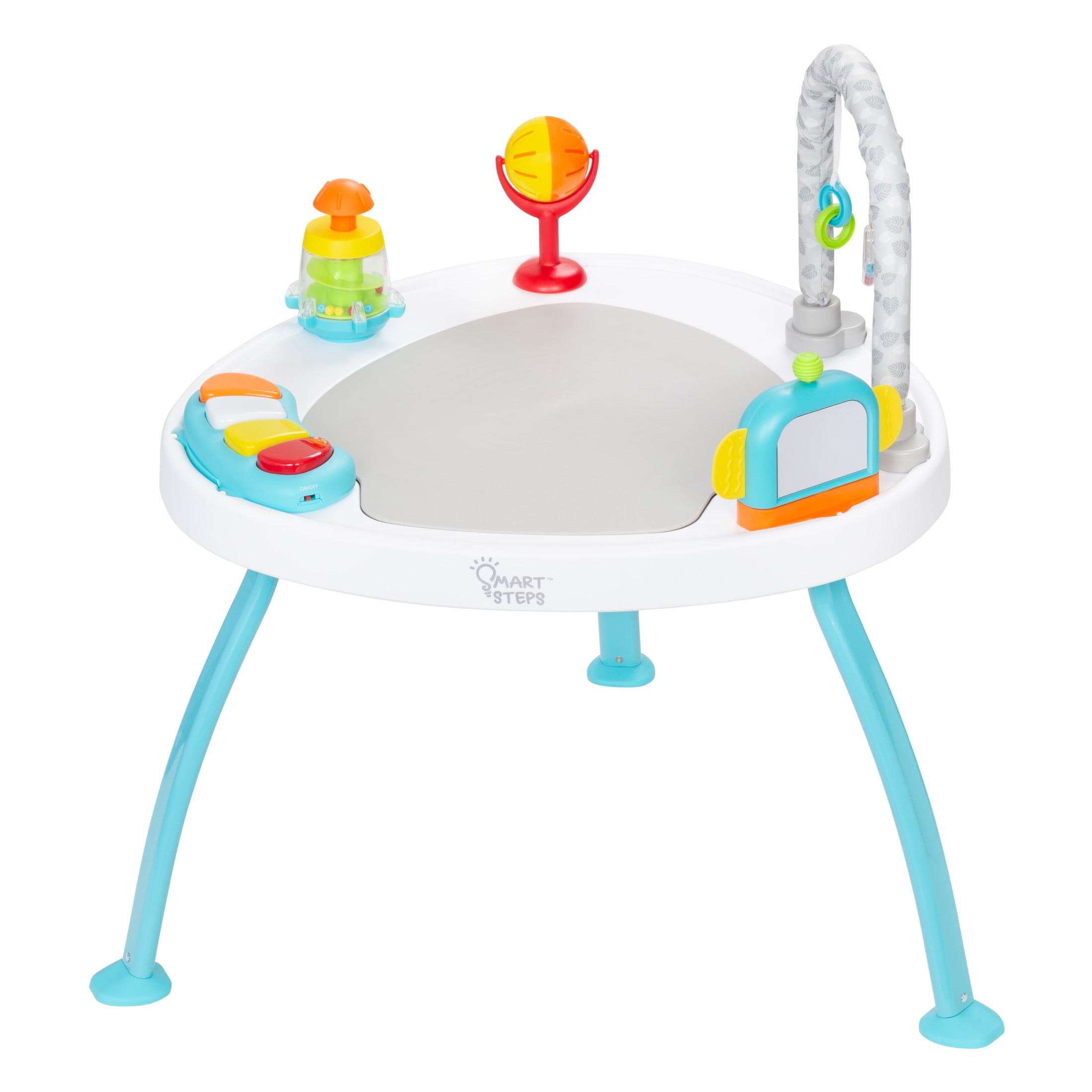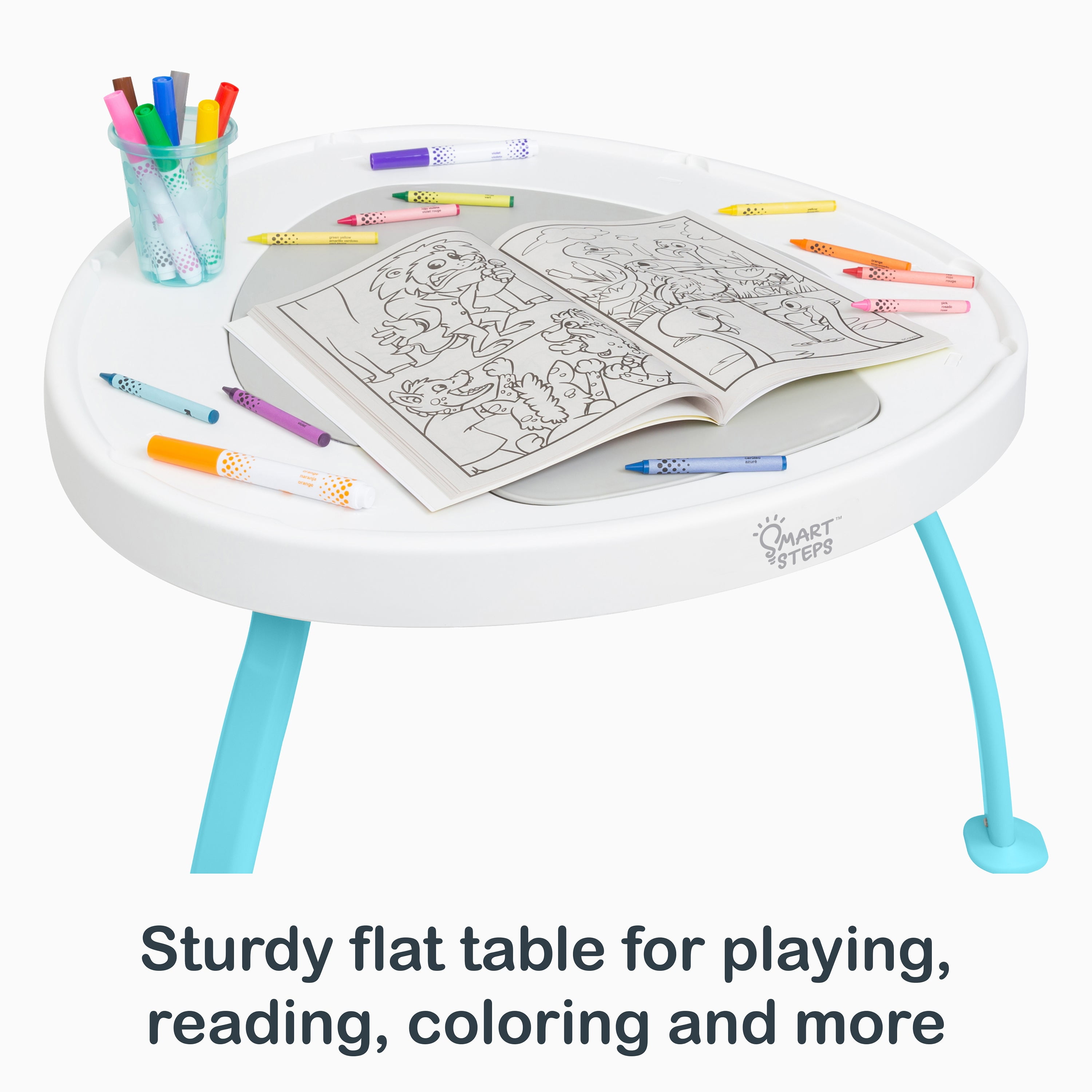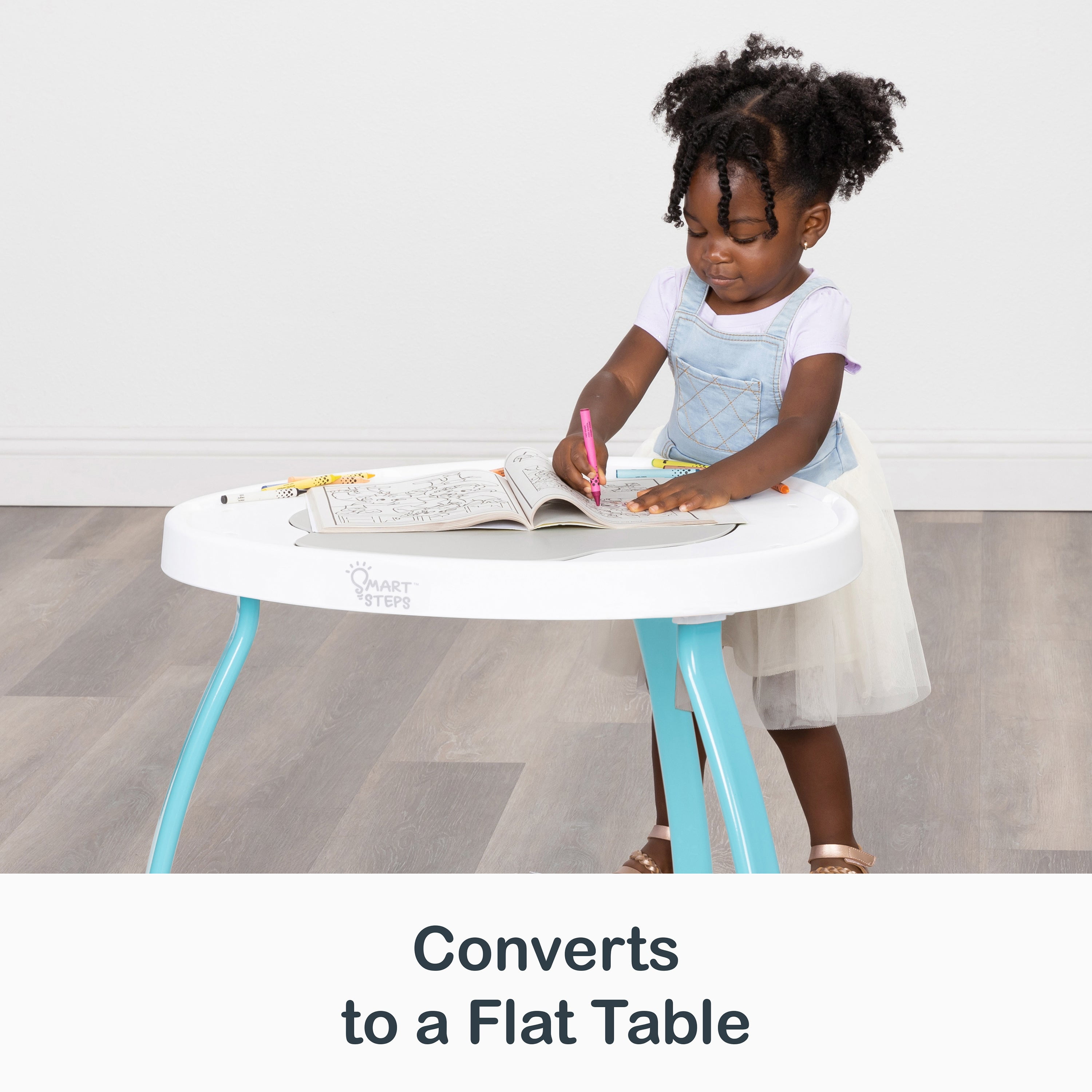 Converts from Activity Center, to Activity Play Table, and to a Flat Table Includes four unique STEM toys that can be taken on-the-go and are interchangeable with other Smart Steps activity products Includes bouncing board with three different positions Seat can move 360 degrees, giving baby motion and a wide range view Musical keyboard plays different melodies Unique three-leg design for stability