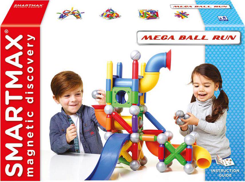 Build the ultimate ball track with this new SMARTMAX magnetic construction set that contains an amazing 71 pieces! With endless options you can make all kinds of crazy machines and let the balls roll. Mega Ball Run contains special parts including tubes and X-shaped bars with 4 magnetic ends. SmartMax enables young children to explore magnetism safely, with strong, oversized pieces that are specifically designed for handling by young kids. SmartMax products are safe and durable, made from the highest quality materials. Our magnets are incredibly strong, able to carry up to 60 times their own weight! SmartMax magnetic bars feature unqiue color codes: “Cold”-colored bars (blue, green, purple) attract “warm” colored bars (red, orange, yellow). Warm-colored bars repel other warm-colored bars, cold-colored bars repel other cold-colored bars. SmartMax products include complete, colorful guides with both product information and sample designs. All parts can be combined with all existing SMARTMAX sets, creating an endless range of possibilities!