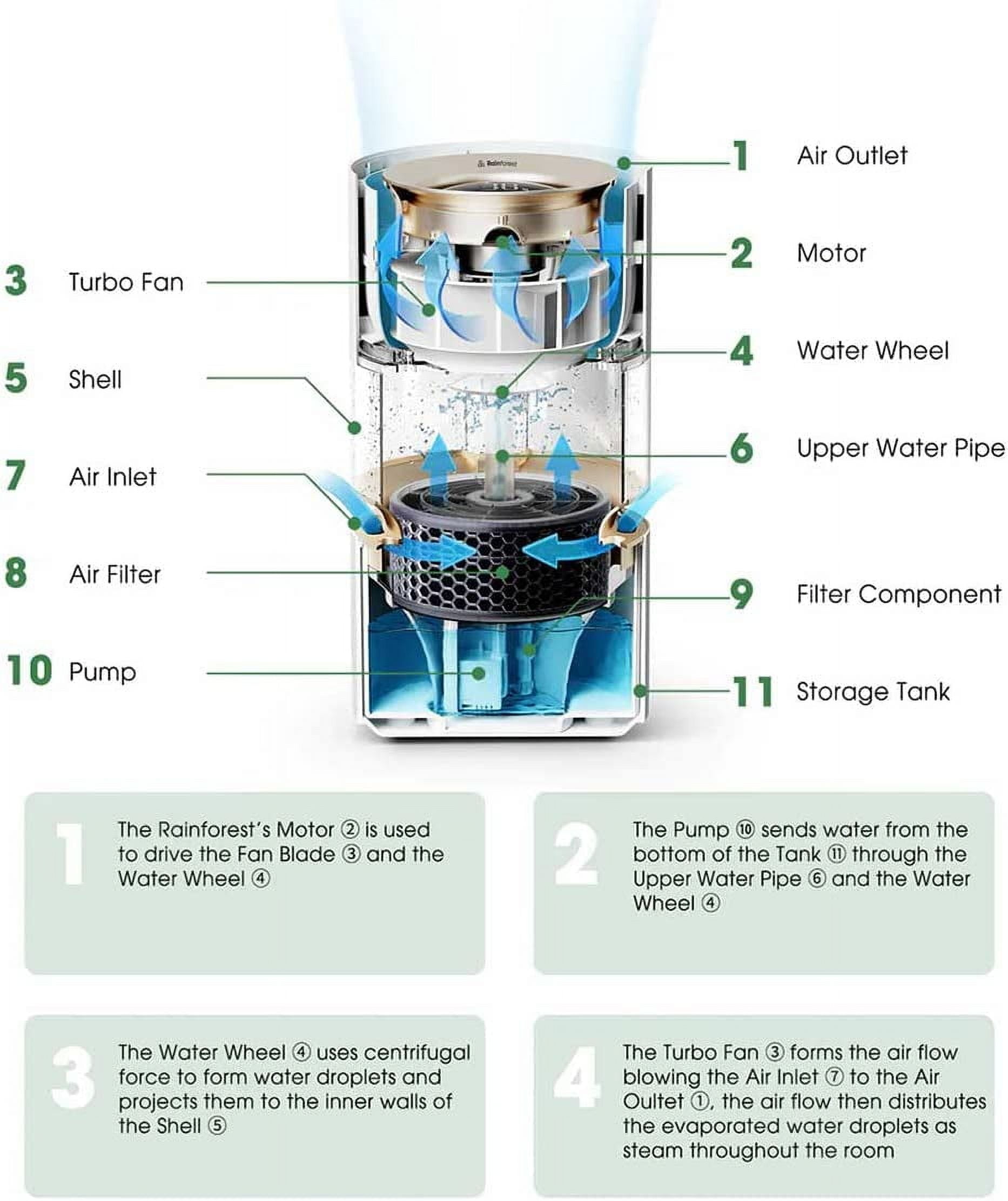 Introducing the Rainforest Humidifier – the first and only humidifier that replicates natural rainfall to humidify your living space. It boasts a unique evaporative technology that humidifies quickly and creates a calm and peaceful environment with its soothing rainfall sounds. With a sleek and modern design that complements any home or office decor, the Rainforest Humidifier delivers exceptional performance and ease of use. It is the ultimate choice for those who strive to enhance their indoor air quality.