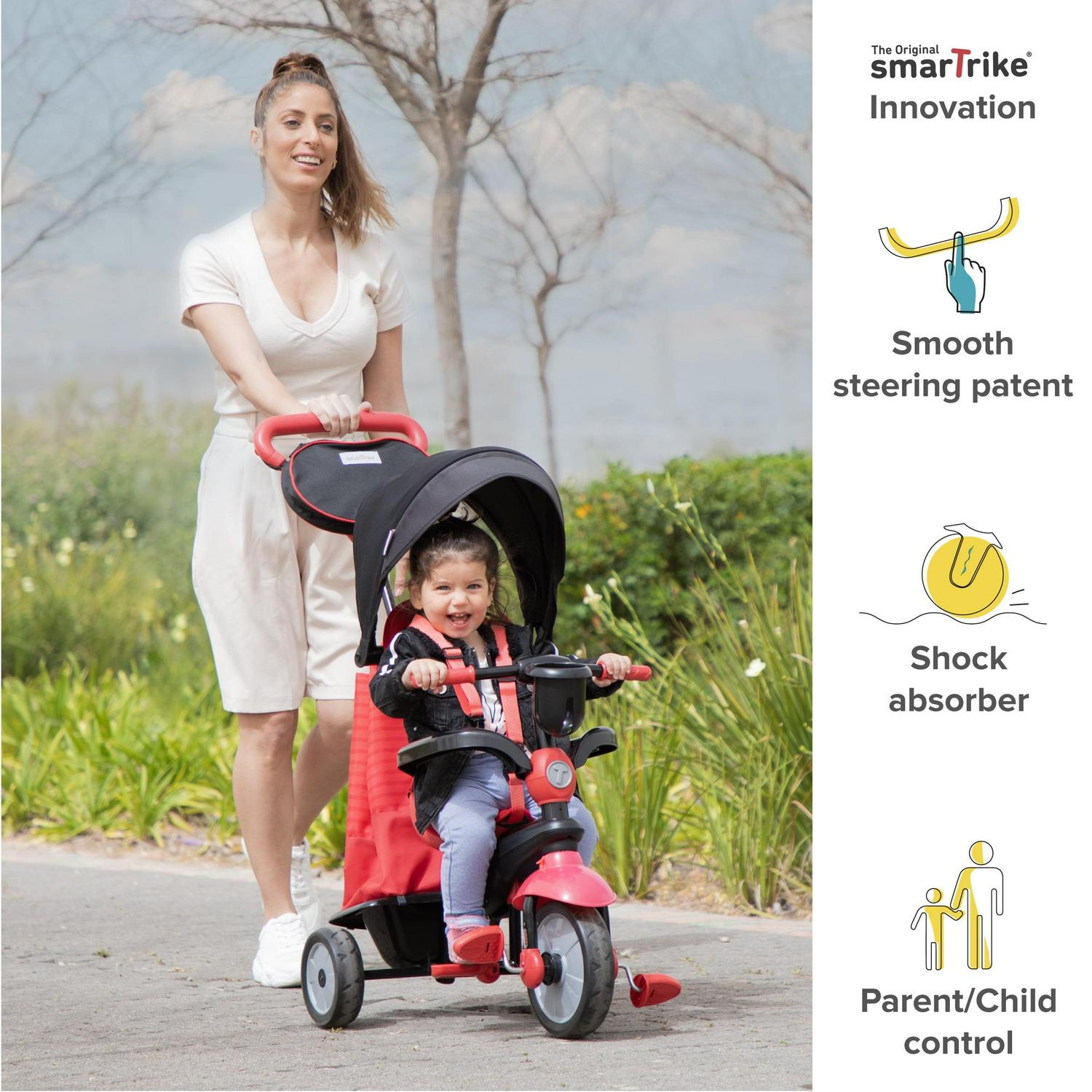 Children love exploring and smarTrike is here to make sure they do it in the safest, easiest way possible with the Red Swing DLX 4-in-1 Toddler Tricycle Push Bike. When they are babies, children start with a small wagon or push-car, then grow quickly through tricycle and scooters. The effortless touch steering technology allows you to take control of the trike with just 1 hand when they can’t. Keep your little ones cool with the sun canopy and ensure their protection with the 3-point harness and safety bar. A large storage bag on the back of the stroller allows you to pack everything you and your toddler need while strolling. Say goodbye to those training wheels, and let your little ones explore independently with this unique 4-in-1 design that adapts to your boy or girl as they grow older! SmarTrike features a line of safe, secure, and reliable riding tricycles for kids that are 1 year old, 2 years old, and 3 years old.