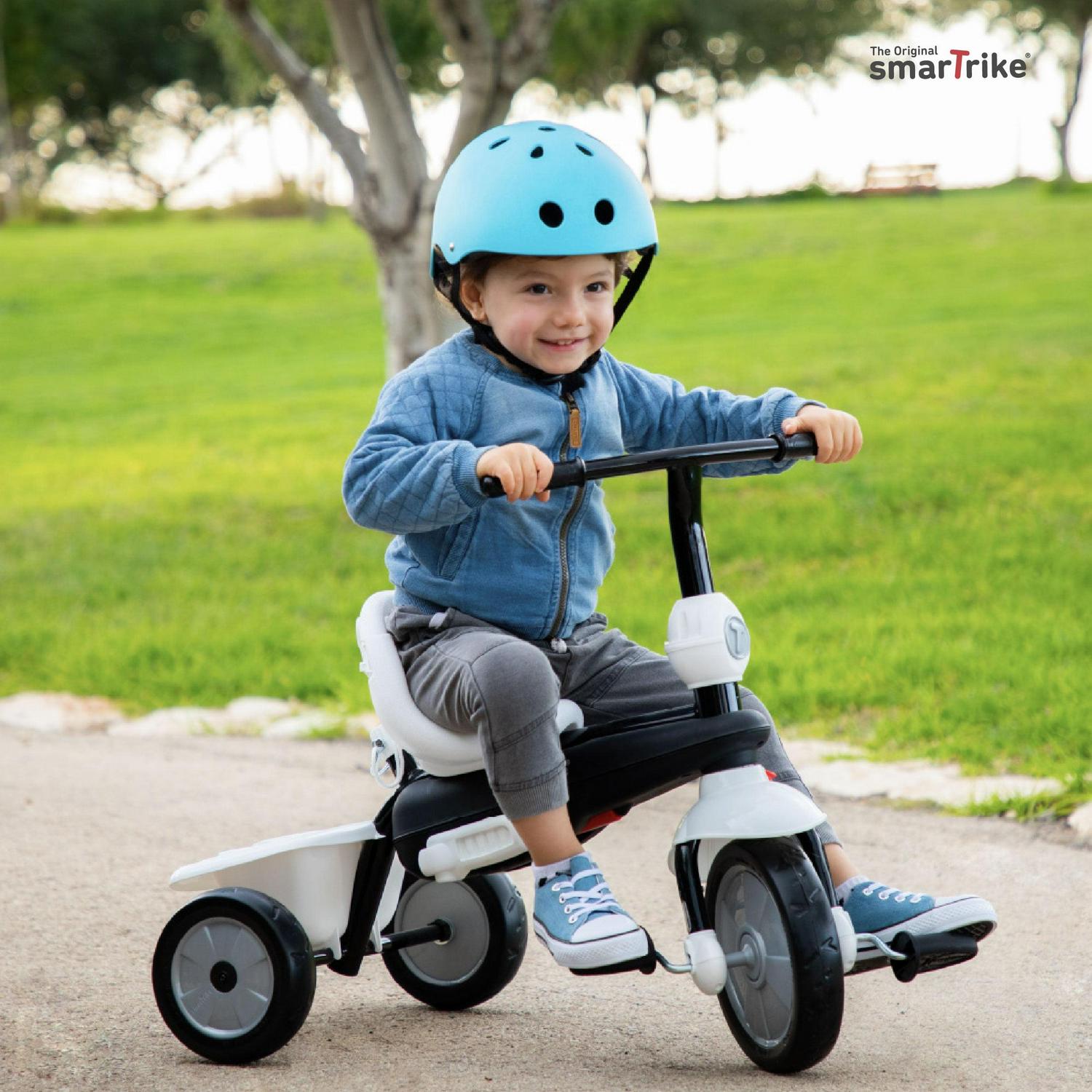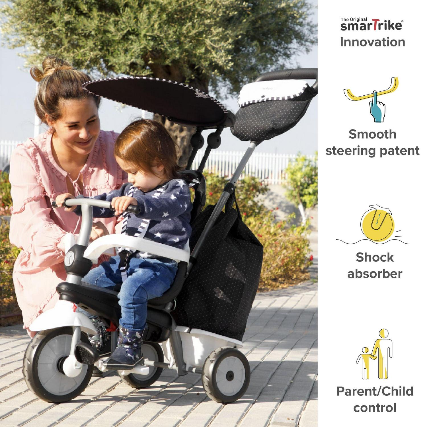 Effortless steering. smarTrike is the only toddler trike with one Touch Steering; just touch the parent handle and the trike intuitively moves in the direction you want to go. Now that s a walk in the park! Dual control mode. Decide who’s in control of the trike, you or your little adventurer. Press the red control button on the front wheel mudguard to switch between parent and child control. Durable wheels. No more bumps on the road, no punctures or noisy wheels. Enjoy a seamless ride with these chic-looking, durable EVA wheels and patented shock absorbers. Safety First. No worries with a 3-point Y harness, removable safety bar, foldable toddler footrest, non-slip pedals and a sun canopy. Added value. High-back support, and parent console makes this the ultimate 4 in 1 tricycle. Fun for kids. Your little one will love learning to ride on this 4 in trike. Also included is a toy basket so they can store all their favorite toys.