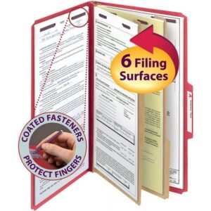 Heavy-duty classification folders feature patent-pending, SafeShield Coated Fastener Technology to help prevent paper tears, finger cuts and excessive fastener crinkling. SafeShield adds protection for papers and fingers while also reducing fastener crinkling. Fasteners on front and back panels and dividers create separate filing surfaces within one folder. These two 2″ coated fasteners on the panels are in positions 1 and 3. Legal-size folder also offers a 2″ expansion and is made of sturdy, 25 point Pressboard stock. The two dividers offer a 1″ SafeShield-coated, twin-prong fastener and are made of 17 point stock. Folder tab is 2/5 cut. Divider tab is 3/8″ high and 1/3 cut. More from the Manufacturer